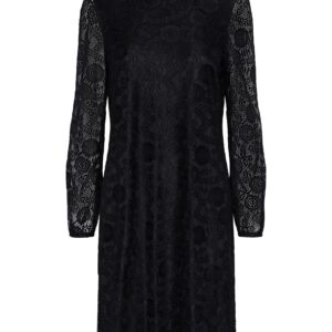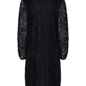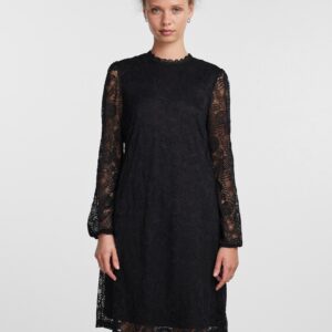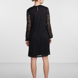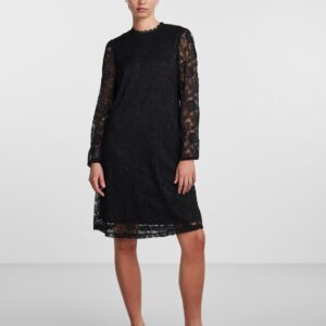 Pieces musta pitsimekko.Läpikuultavat pitkät hihat, joissa joustava hihansuu. Pystykaulus, jossa niskass nappi sekä halkio. Hieman A-linjainen malli. Joustava vuorikangas.