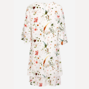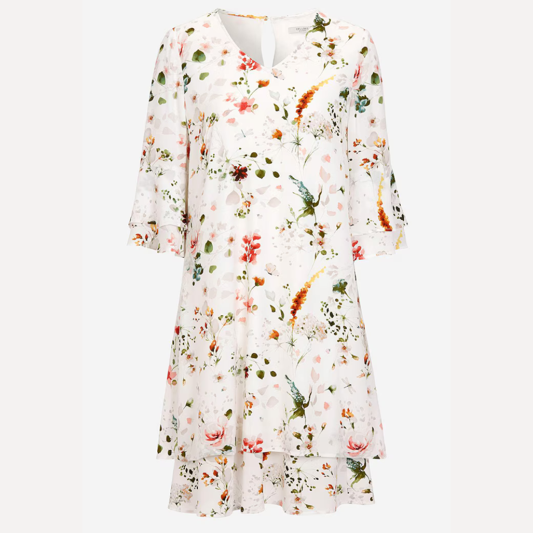 Cellbes kukkakuvioinen mekko, jossa luonnovaalea pohjaväri. V-pääntie, niskassa halkio sekä nappi. 3/4 mittaiset hihat, joissa hihansuissa röyhelöt. A-linjainen malli, helmassa kerrostus. Joustamaton laskeutuva pintamateriaali, joustava vuorikangas.