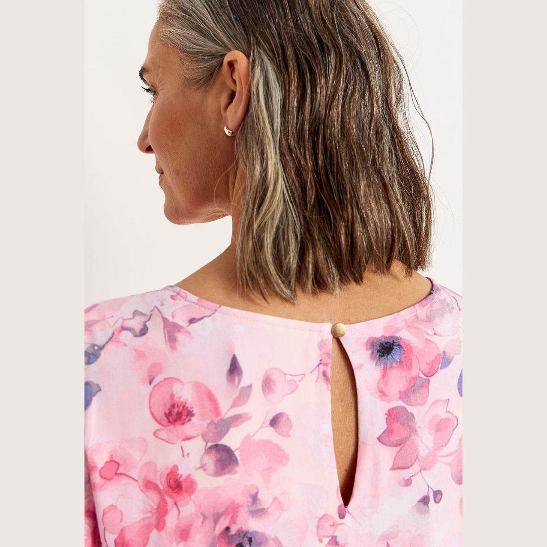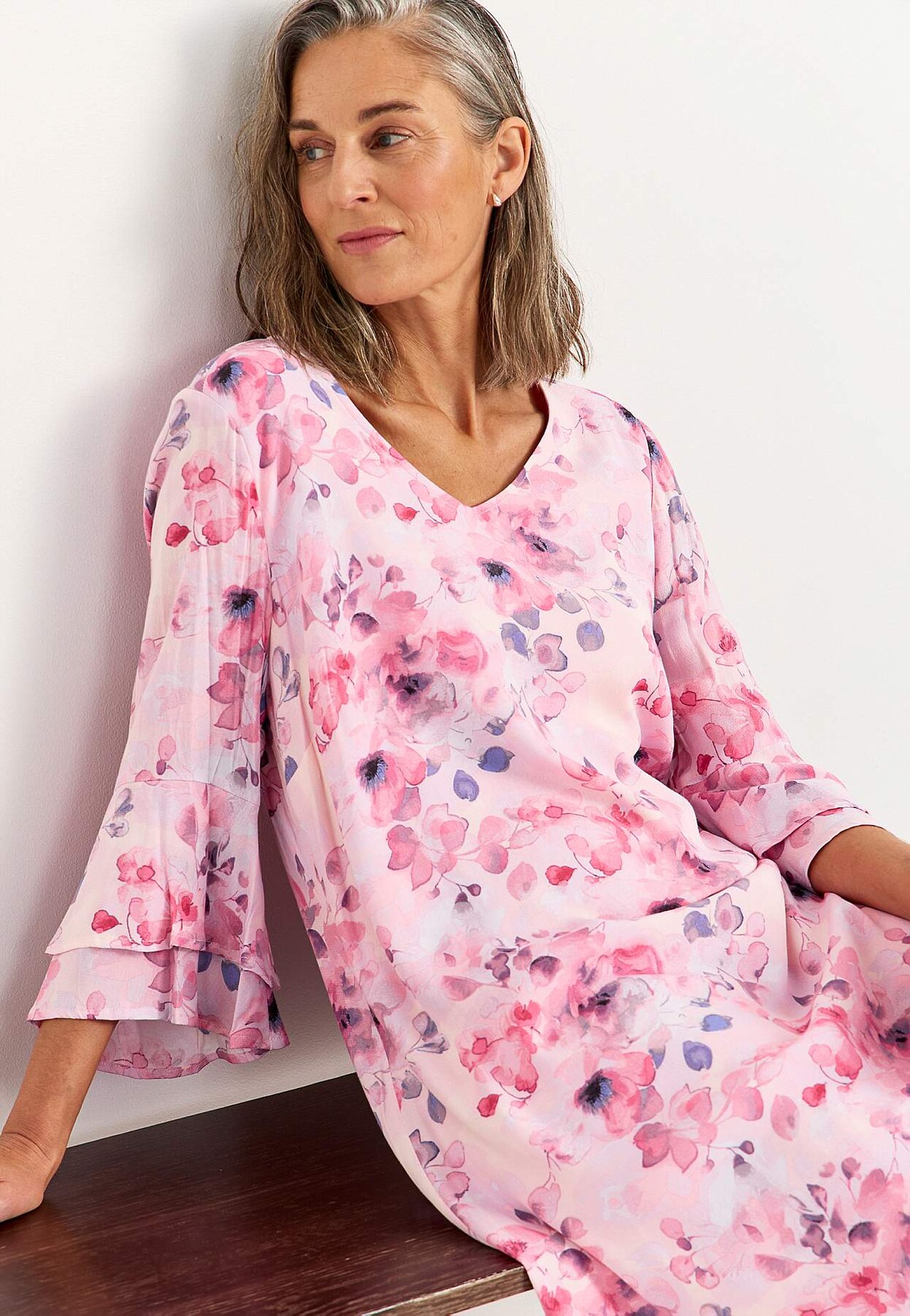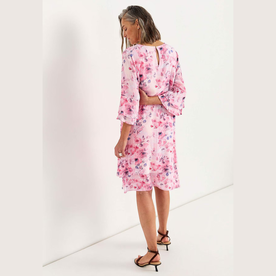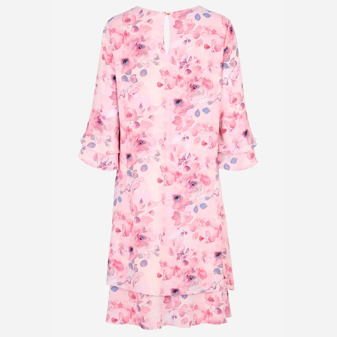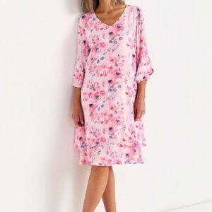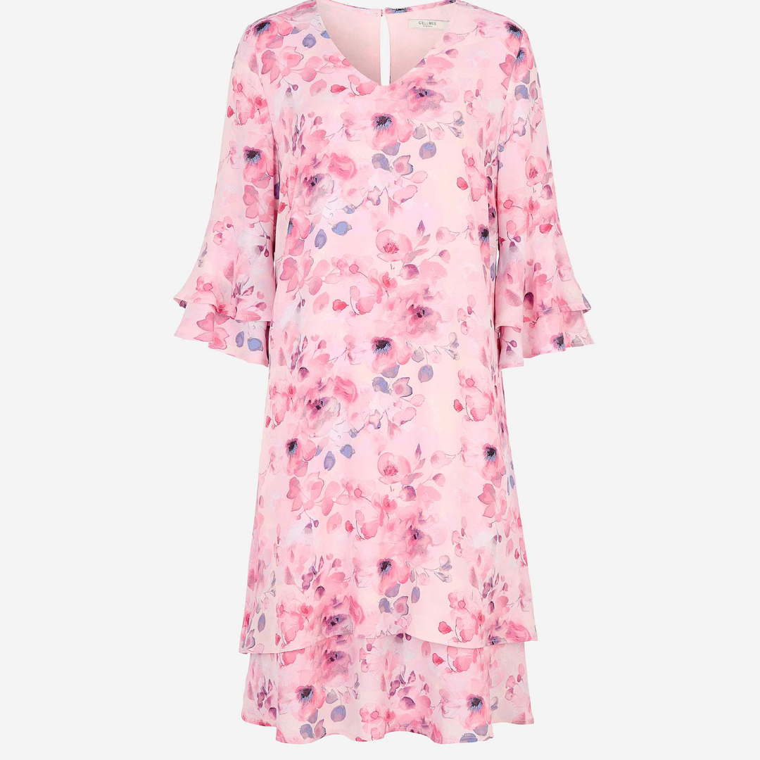Cellbes vaaleanpunainen / kukallinen A-linjainen mekko. 3/4 mittaiset hihat, joissa levenevät hihansuut- V-pääntie, niskassa nappi sekä halkio. Joustava vuorikangas.