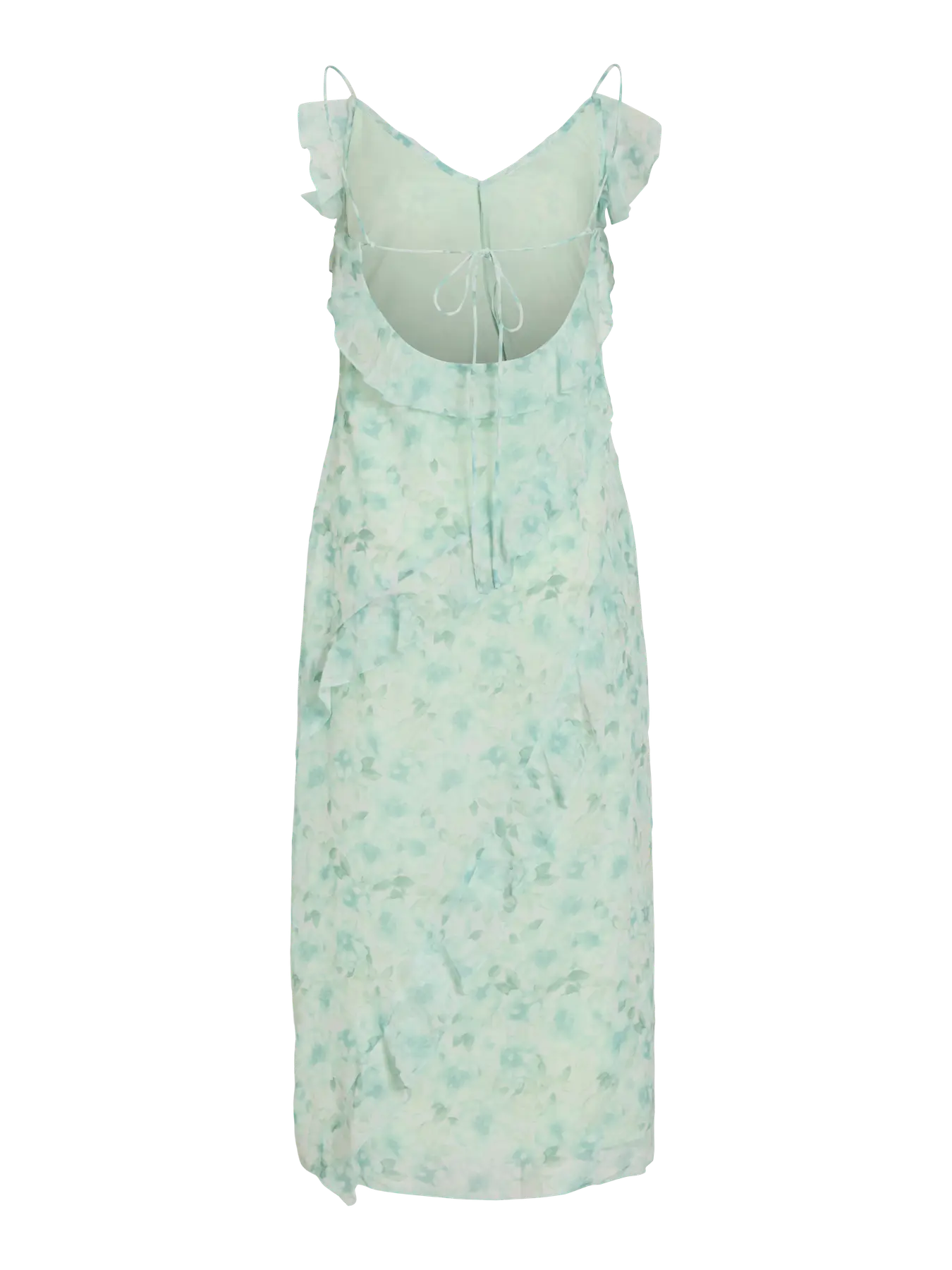 Vila vaaleanvihreä kuviollinen mekko. Pitkä tyköistuva malli. Kapeat olkaimet. Syvään uurretttu selkäosa, jossa solmittavat nauhat. Vetoketju toisella sivulla. Ohut päällikangas, yksivärinen vuorikangas. Halkio edessä toisella sivulla.