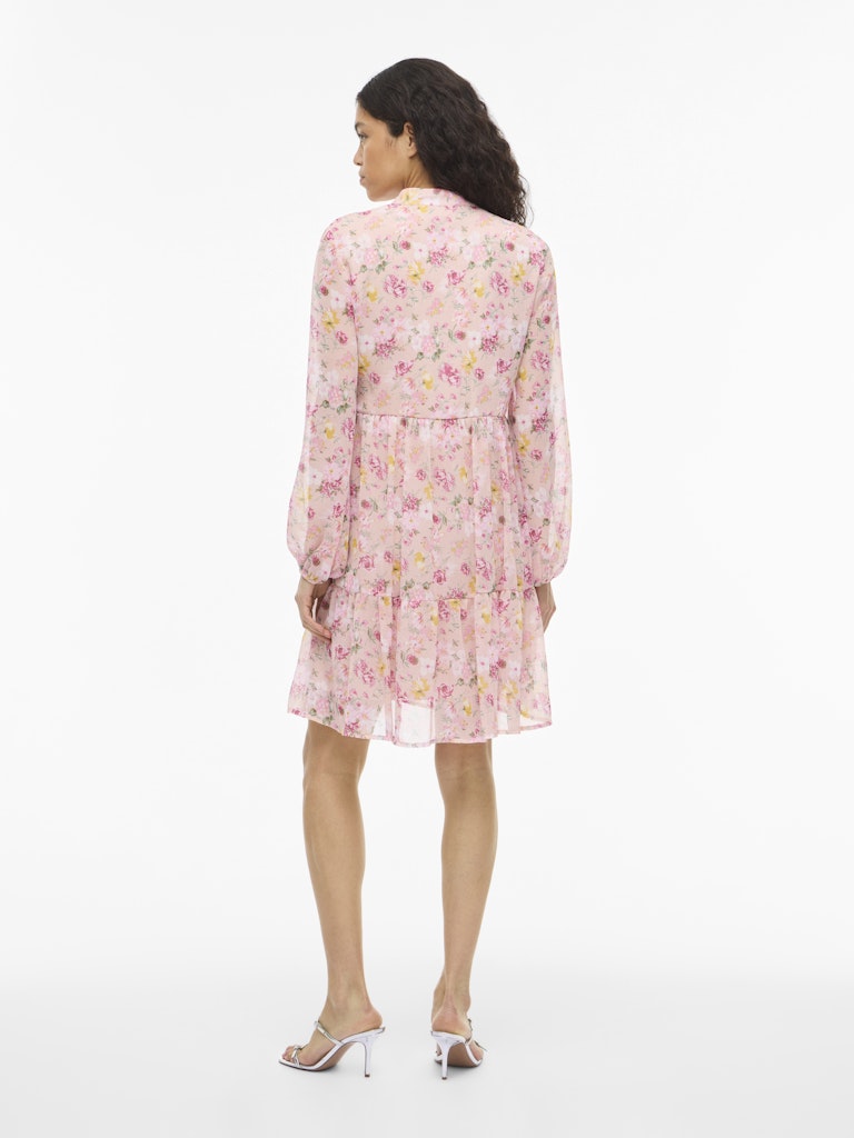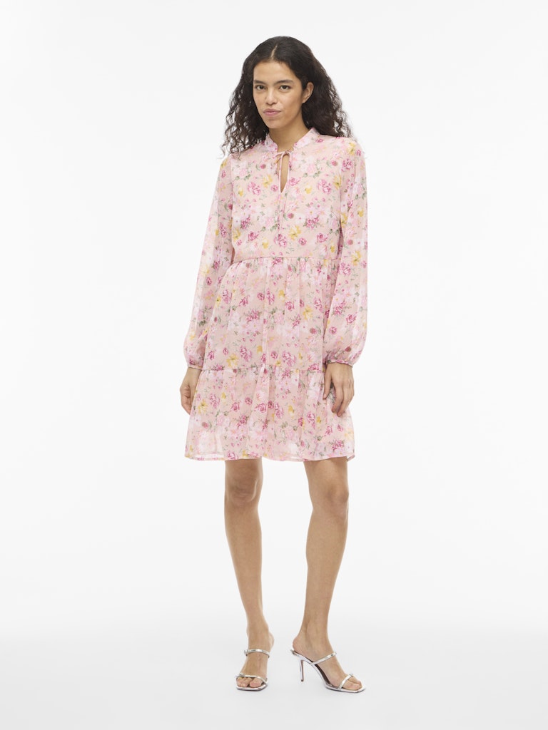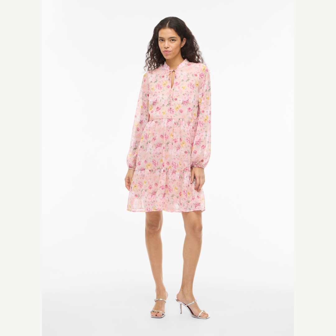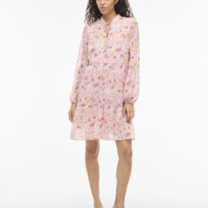 Vila vaaleanpunainen kukkakuvioinen mekko. Ohut läpikuultava päällikangas, yksivärinen joustava vuorikangas. Poikkileikkaus vyötäröllä sekä helmassa.  Läpikuultavat hihat. V-pääntie, jossa solmittavat nauhat.