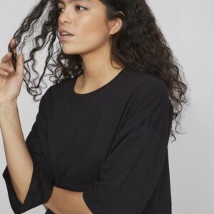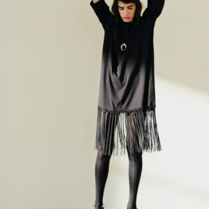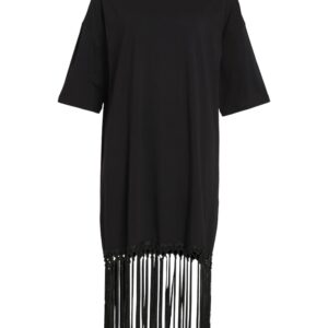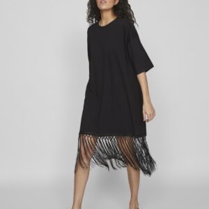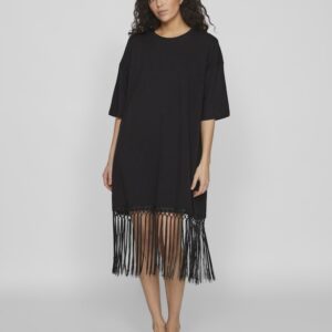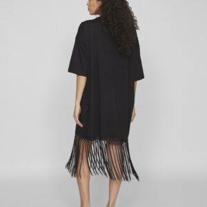 Vila musta hapsumekko. O-pääntie, lyhyet hihat. Rento oversize malli. Helmassa hapsut. Joustava materiaali.