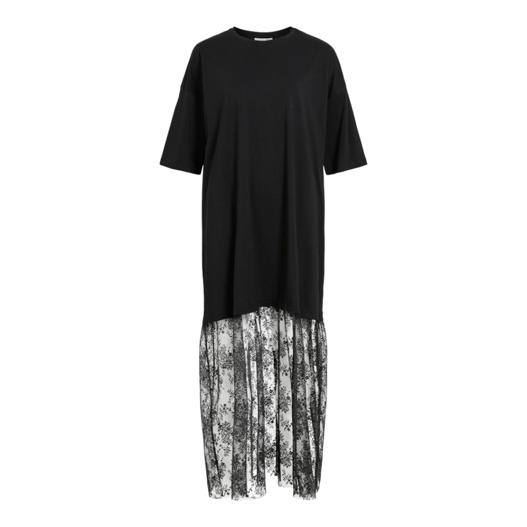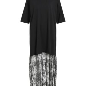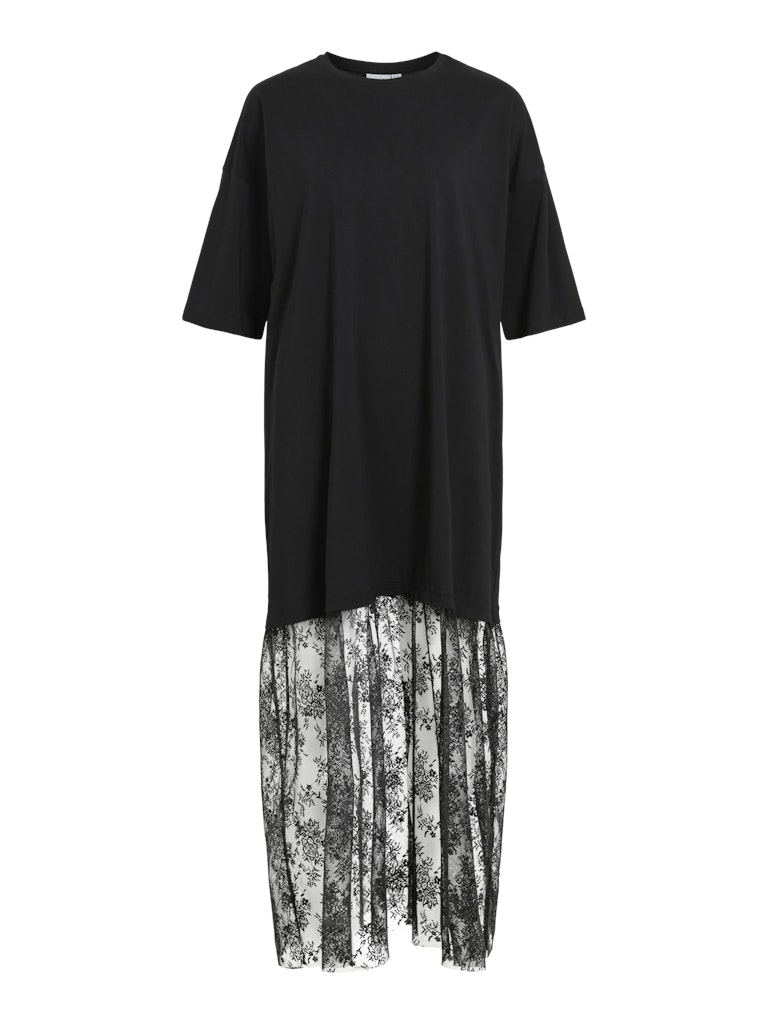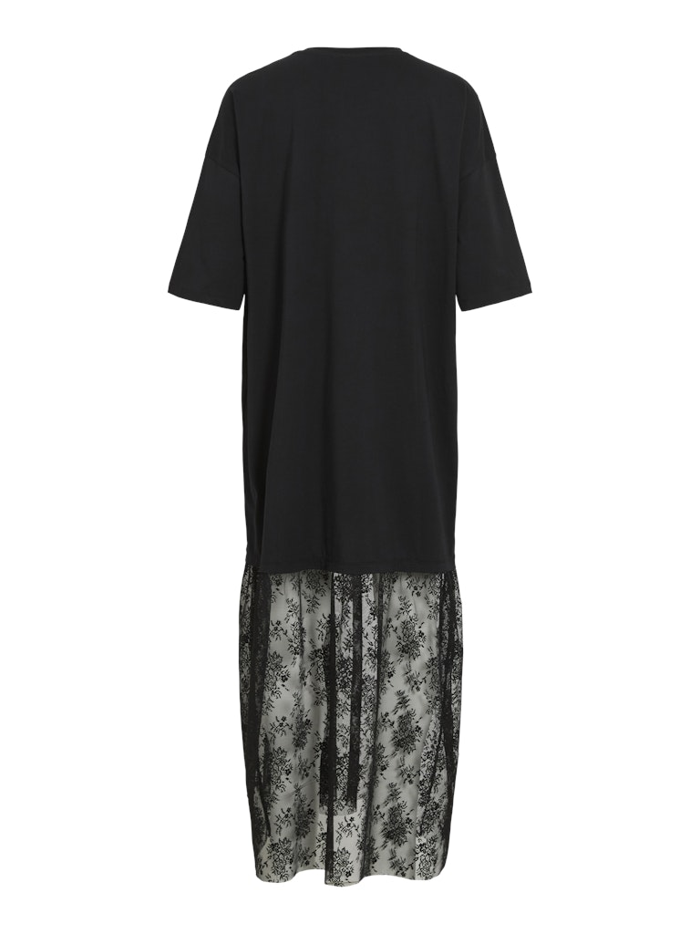 Vila musta T-paita mekko. Rento oversize malli. Joustava materiaali, O-pääntie, lyhyet leveät hihat. Alaosa pitsiä.