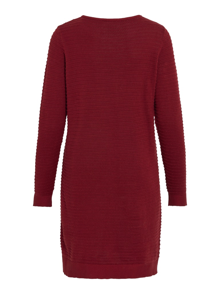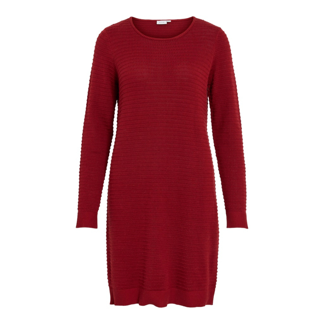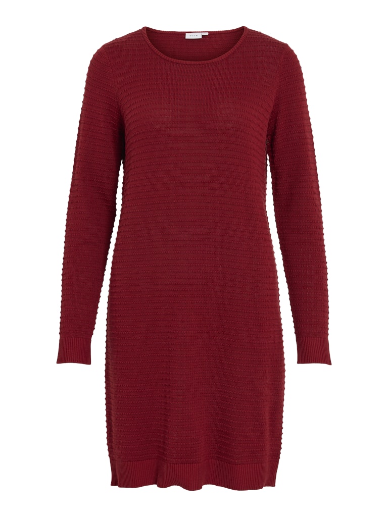 Vila kirkkaanpunainen neulemekko. Joustava kudottu eläväpintainen materiaali. O-pääntie, pitkät hihat. Suora helma, jossa reunassa resori.