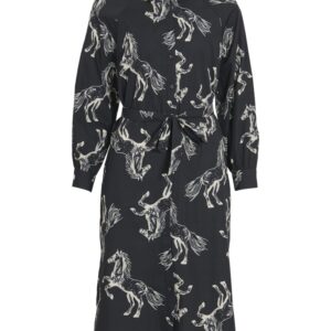 Vila musta hevoskuvioinen pitkähihainen midimittainen mekko. Napitus edessä, sekä hihansuissa. Taskut sekä halkiot sivuilla. Mukana solmittava irtonainen vyö.