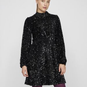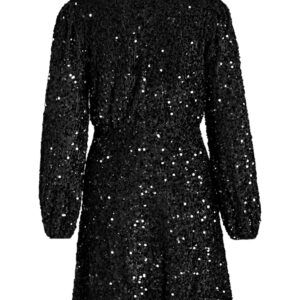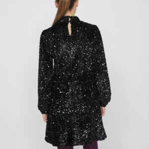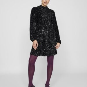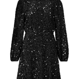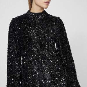 Vila musta paljettimekko. Korkea kaulus, niskassa halkio sekä napit. Pitkät hihat, hihansuissa resorit. Joustava vyötärökaistale. Joustava materiaali, joustava vuorikangas.