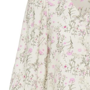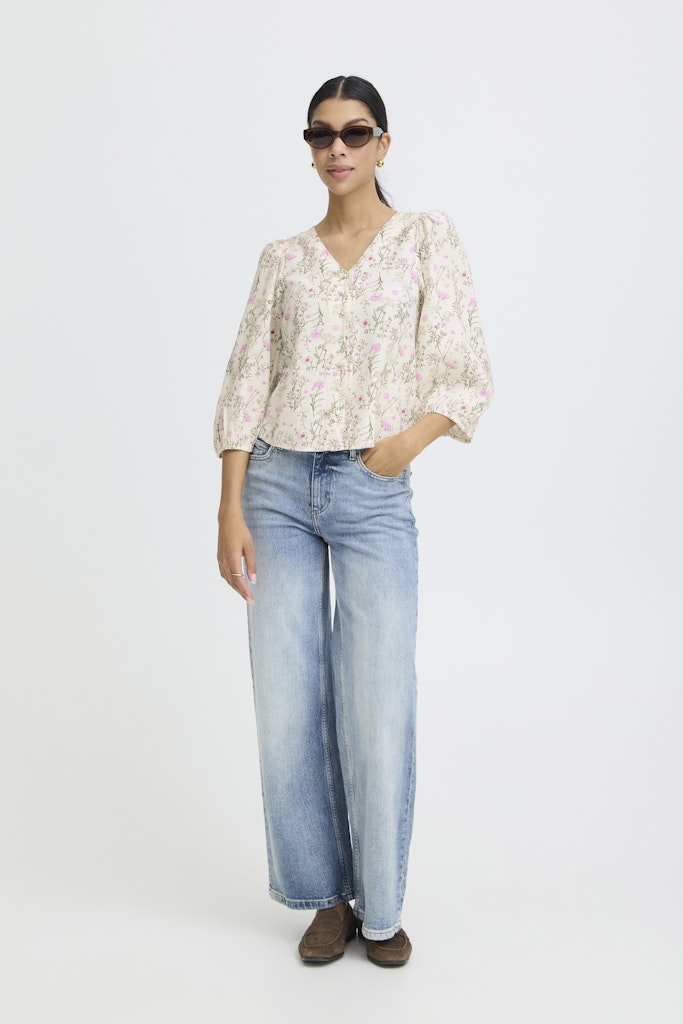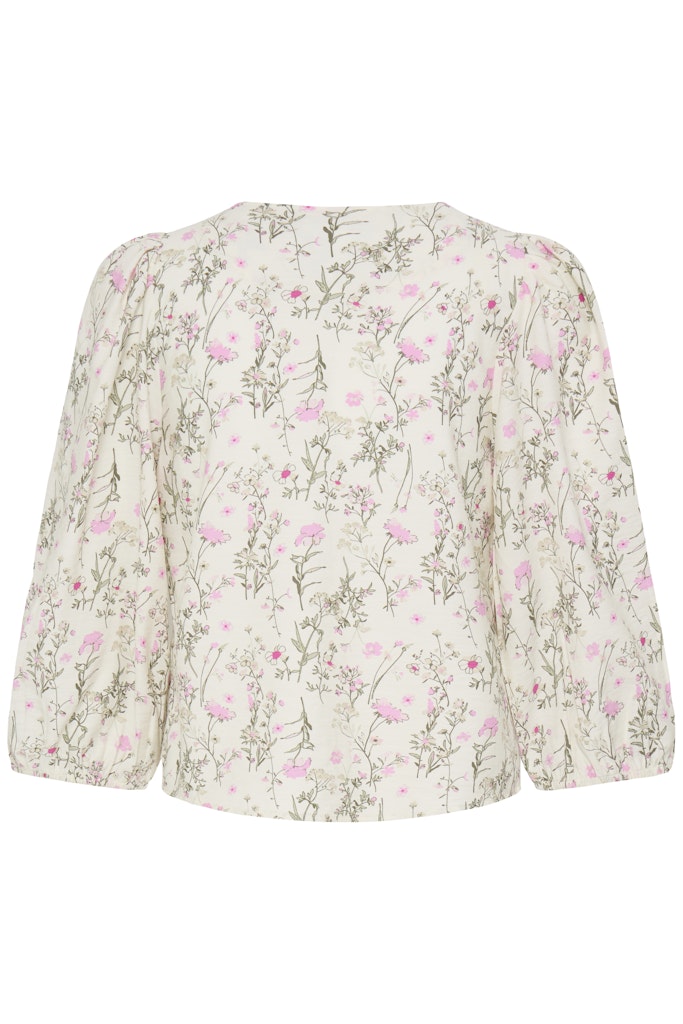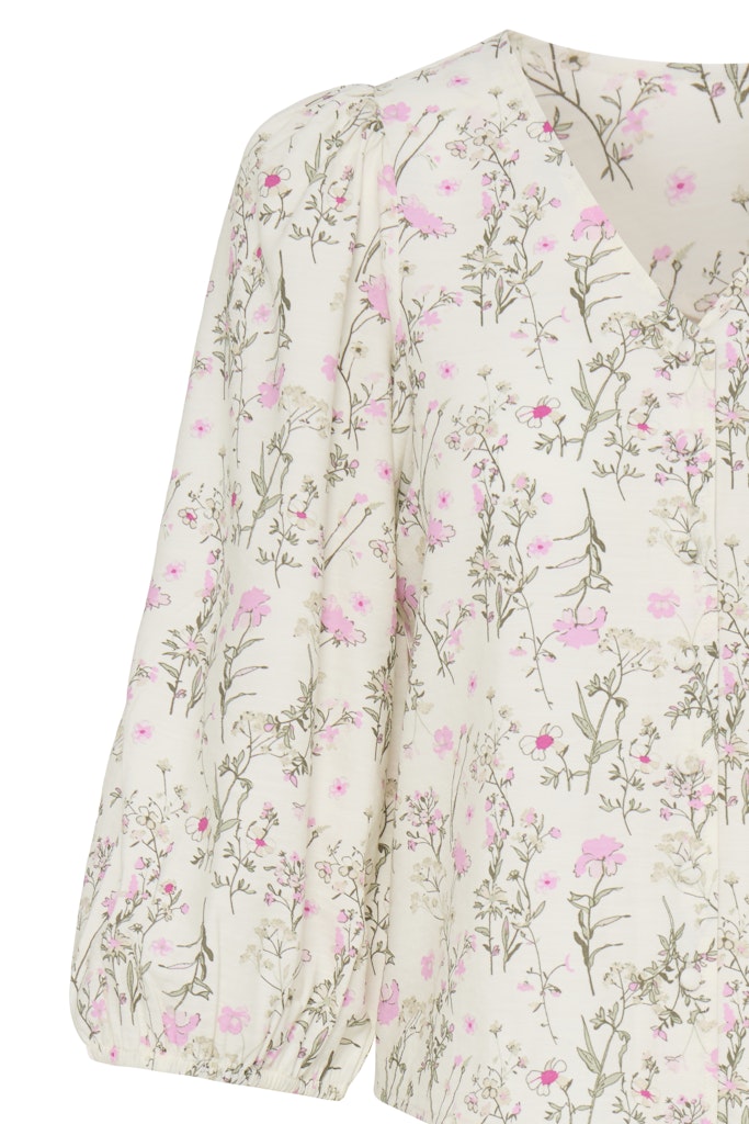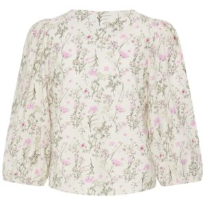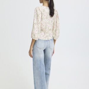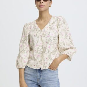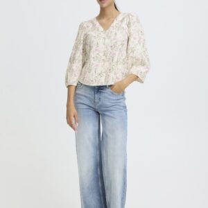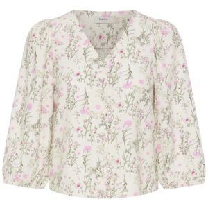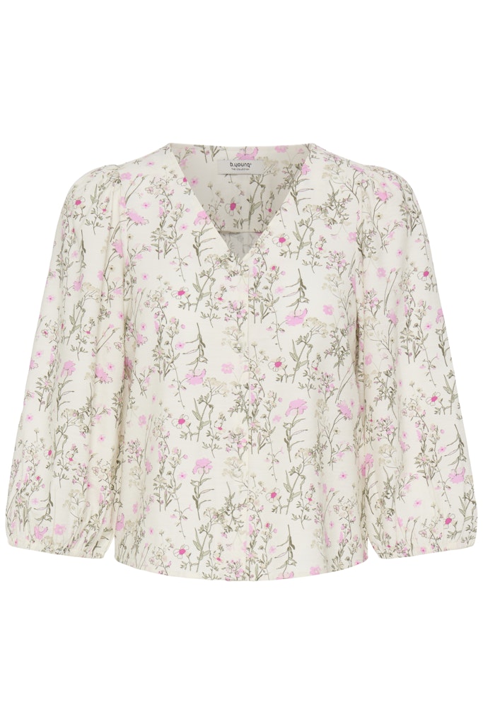 B.young luonnonvalkoinen kukkakuvioinen lyhyt pusero. V-pääntie, napitus edessä. 3/4 mittaiset lyhyet hihat, joissa joustava hihansuu.