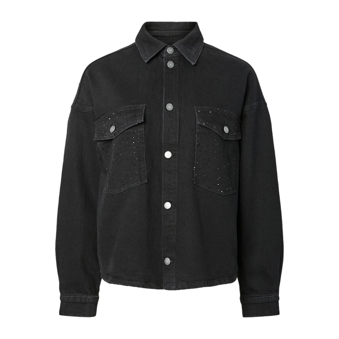 Pieces musta farkkukankainen paitatakki. Rento lyhyt malli. Joustava materiaali. Napilliset etutaskut, joissa mustia strasseja. Selkäpuolella yläosassa mustia strasseja. Napitus edessä sekä hihansuissa.