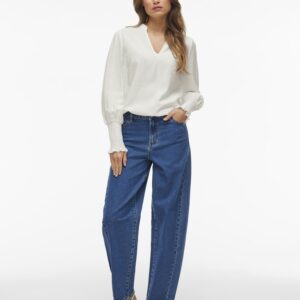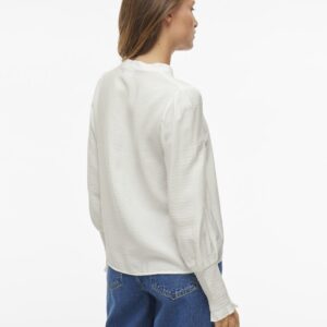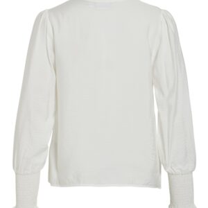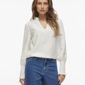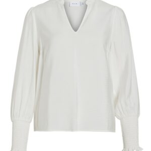 Vila luonnonvalkoinen pitkähihainen pusero. Eläväpintainen laskutuva materiaali. V-pääntie. Olkapäillä rypytys, hihansuissa joustavat rypytykset.
