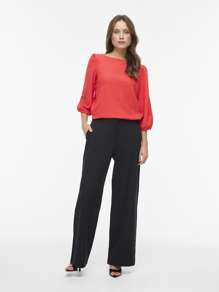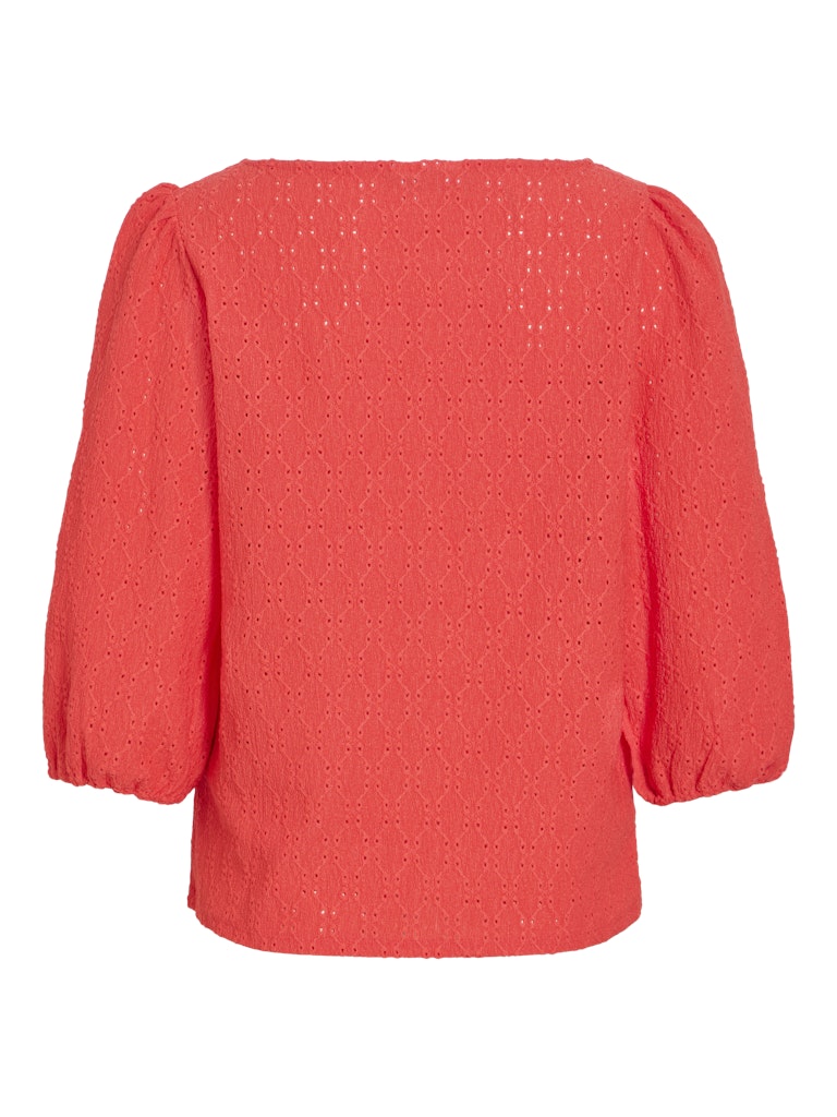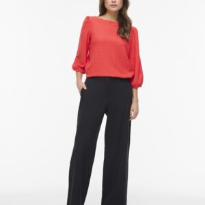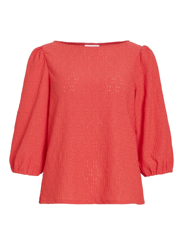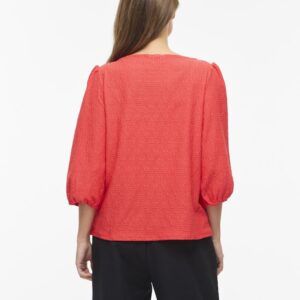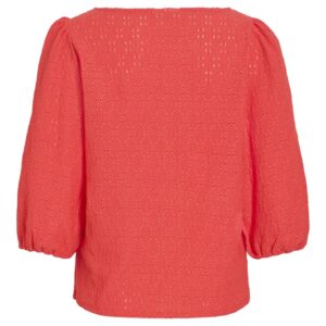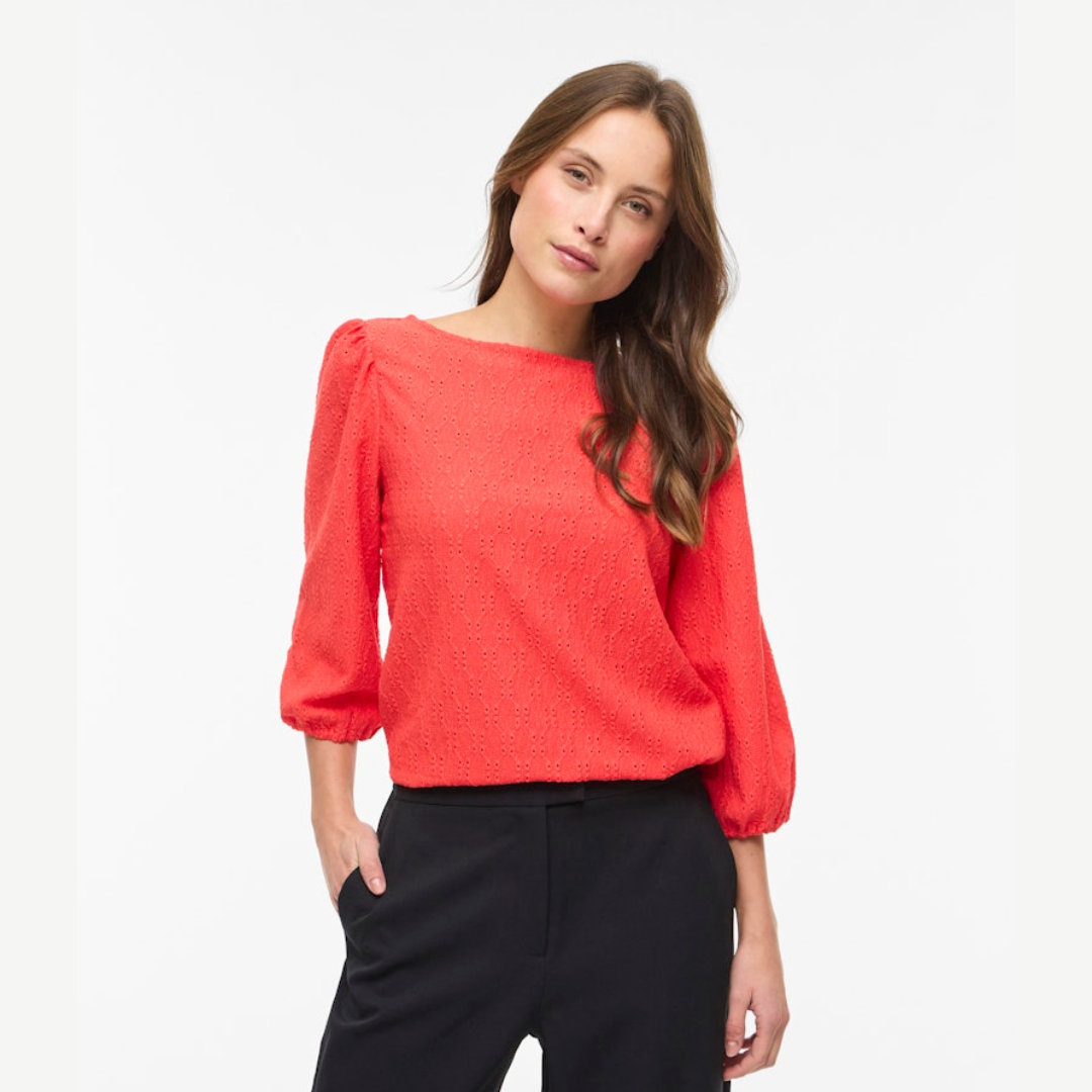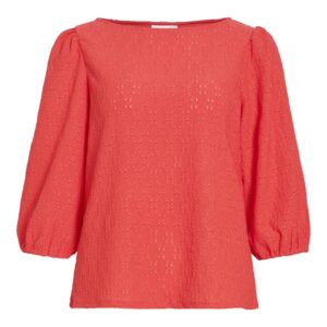 Vila oranssinpunainen pusero. Venepääntie. 3/4 hihat, joissa rypytys olkapäällä ja kuminauha hihansuissa. Joustava eläväpintainen materiaali.