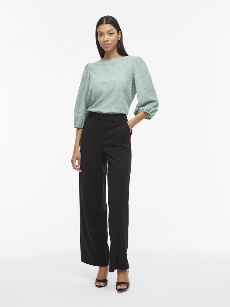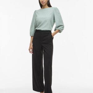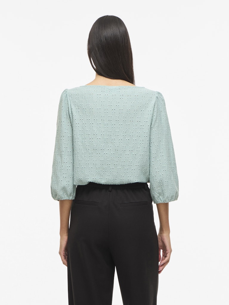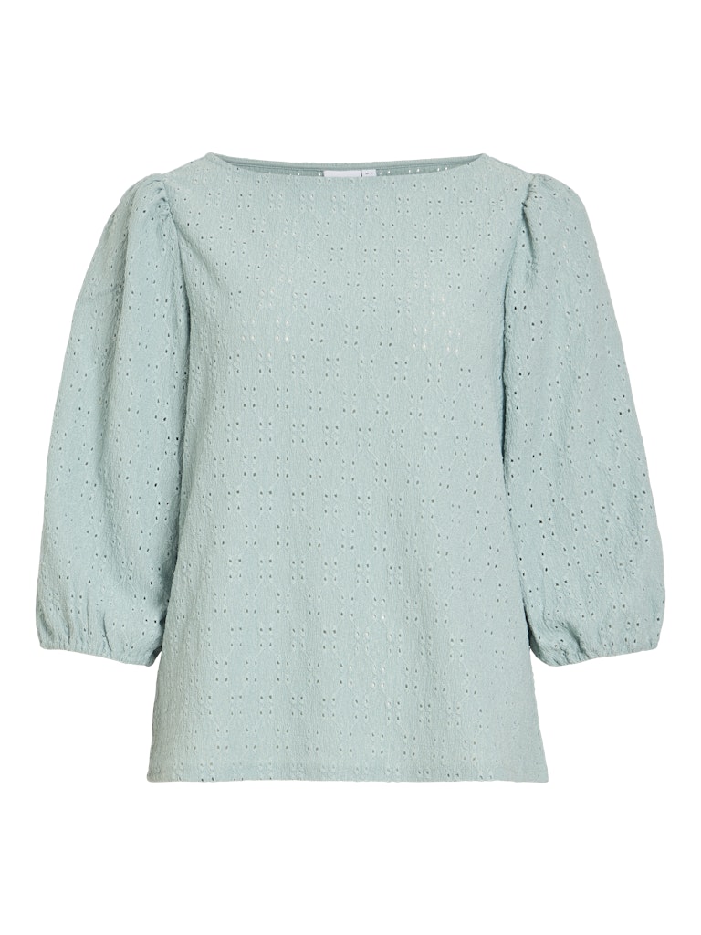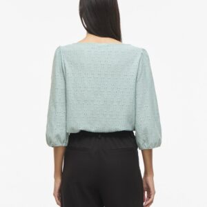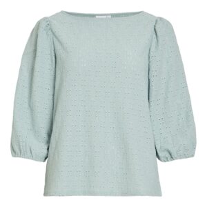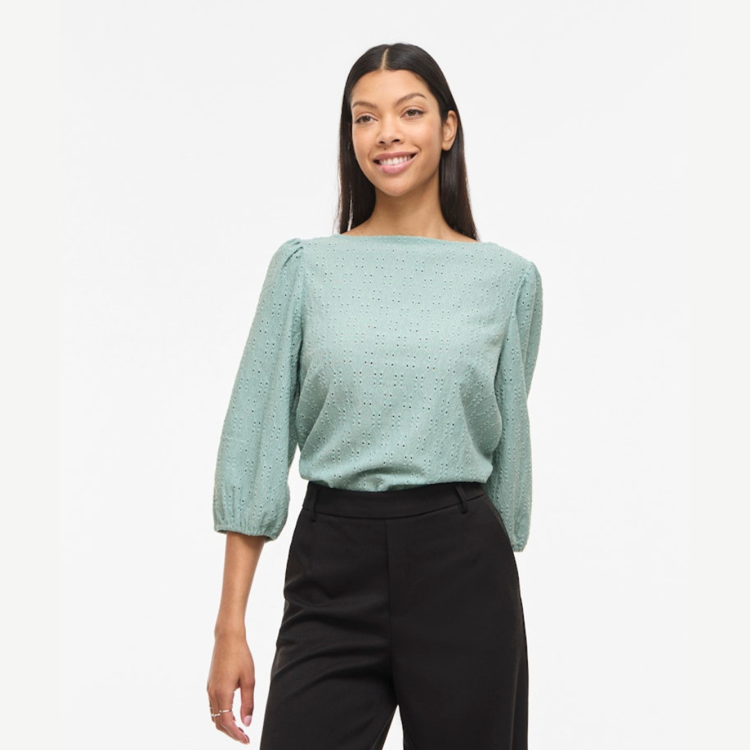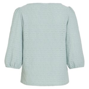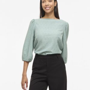 Vila utuinen vihreä pusero. Venepääntie. 3/4 hihat, joissa rypytys olkapäällä ja kuminauha hihansuissa. Joustava eläväpintainen materiaali.