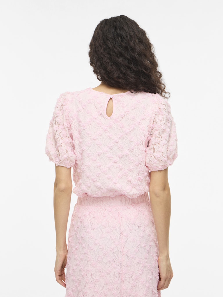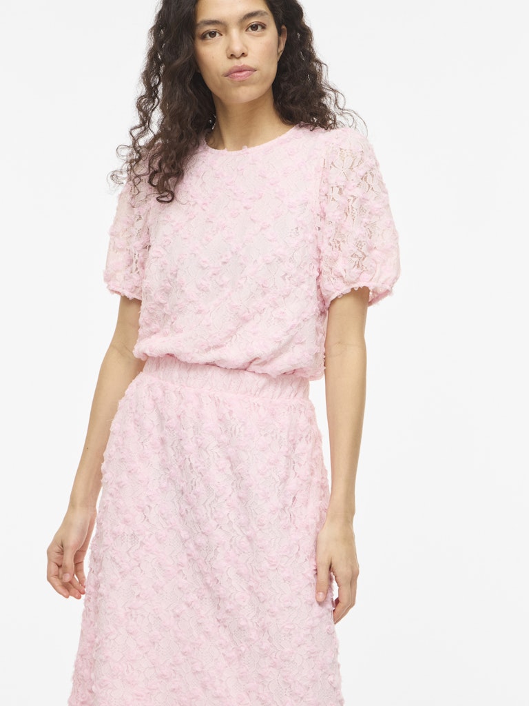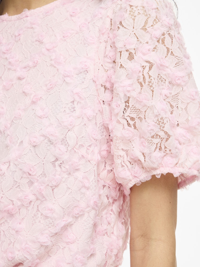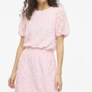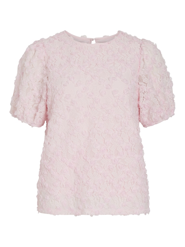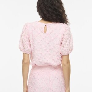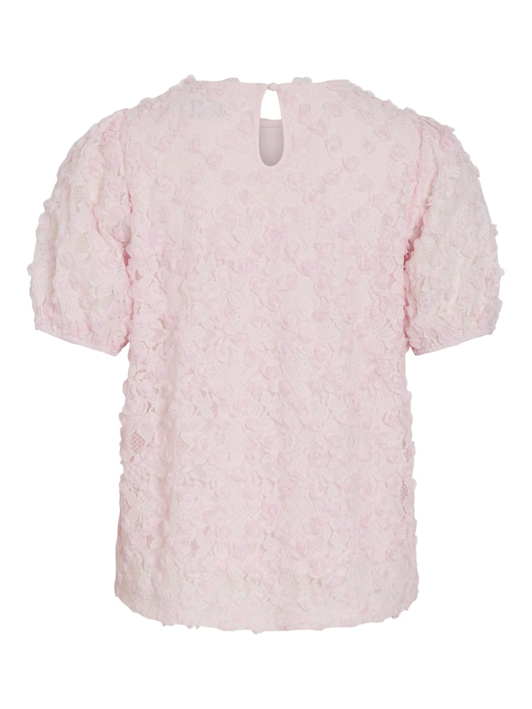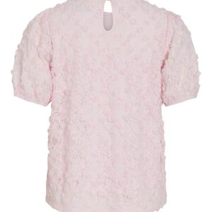 Vila vaaleanpunainen Toppi. Eläväpintainen läpikuultava pitinen päällikangas, ohut joustava vuorikangas. Lyhyet hihat, joissa hihansuissa kuminauhat. O-pääntie, niskassa halkio + nappi.