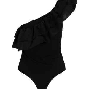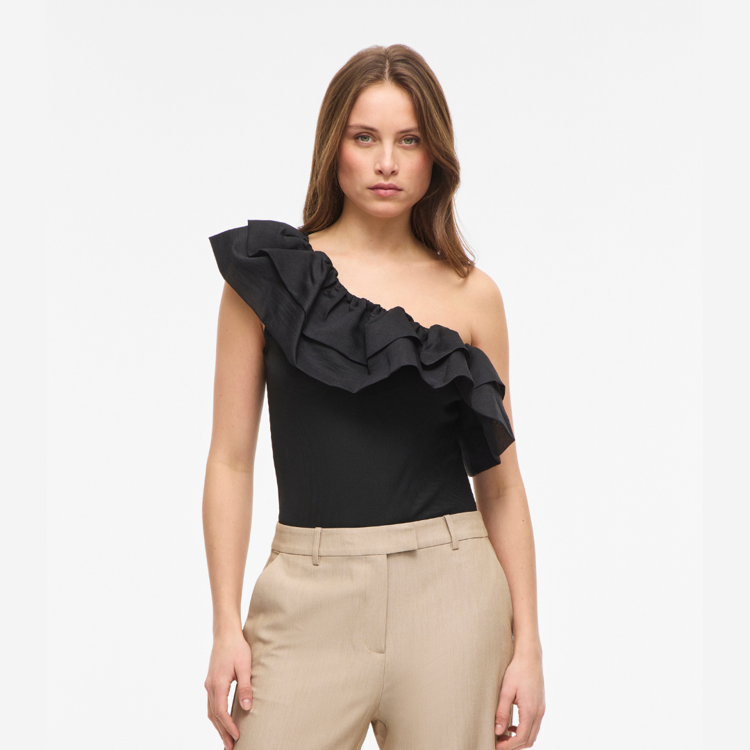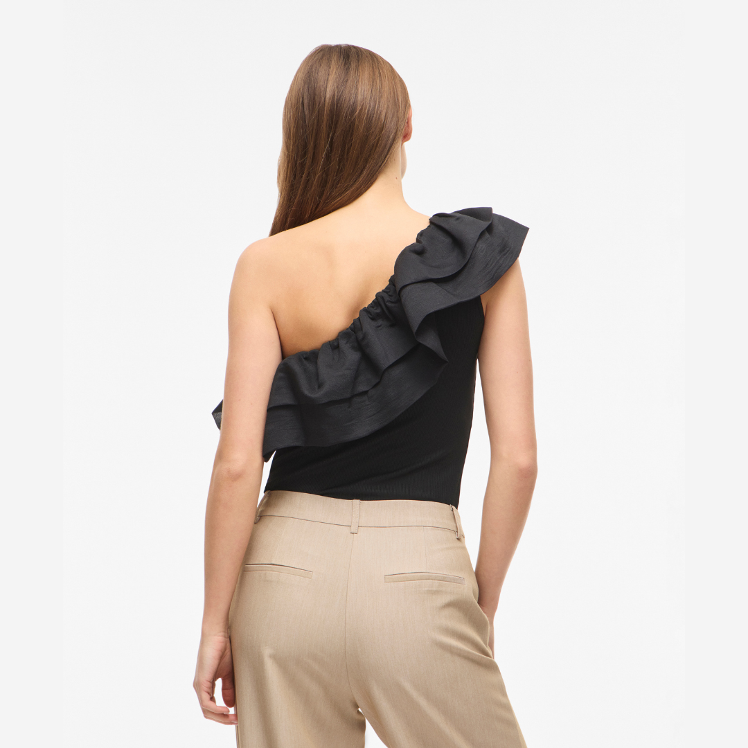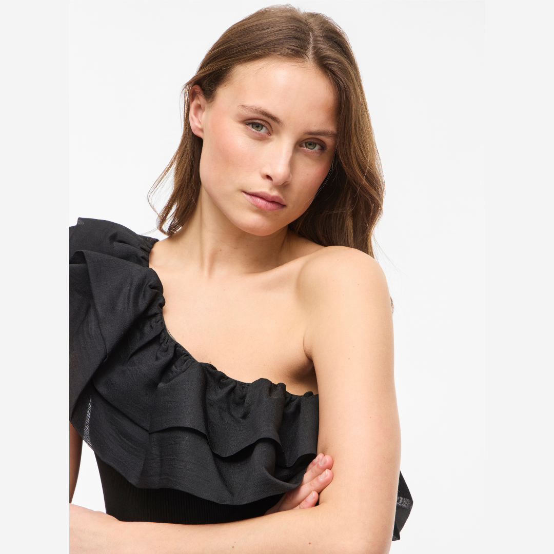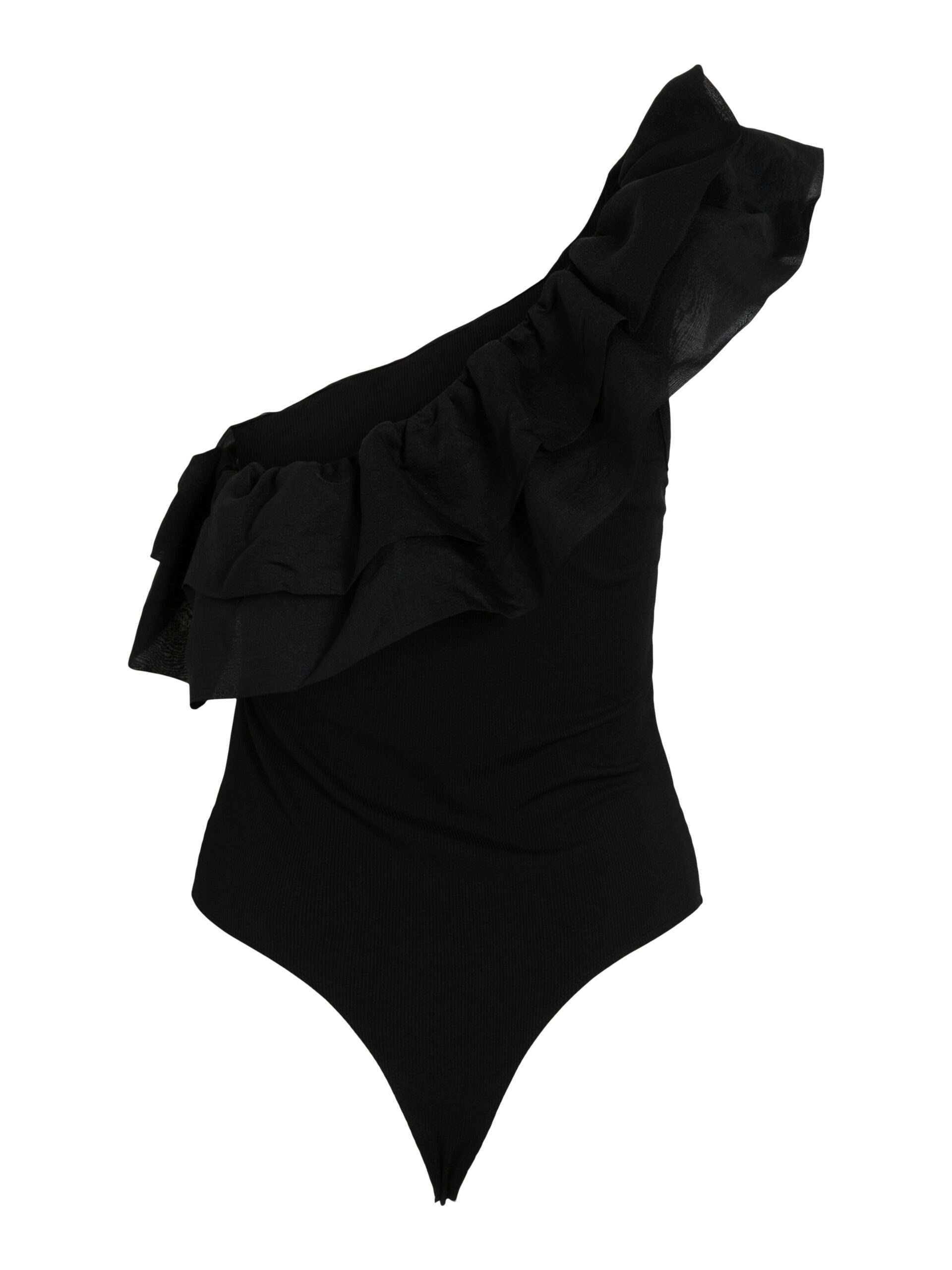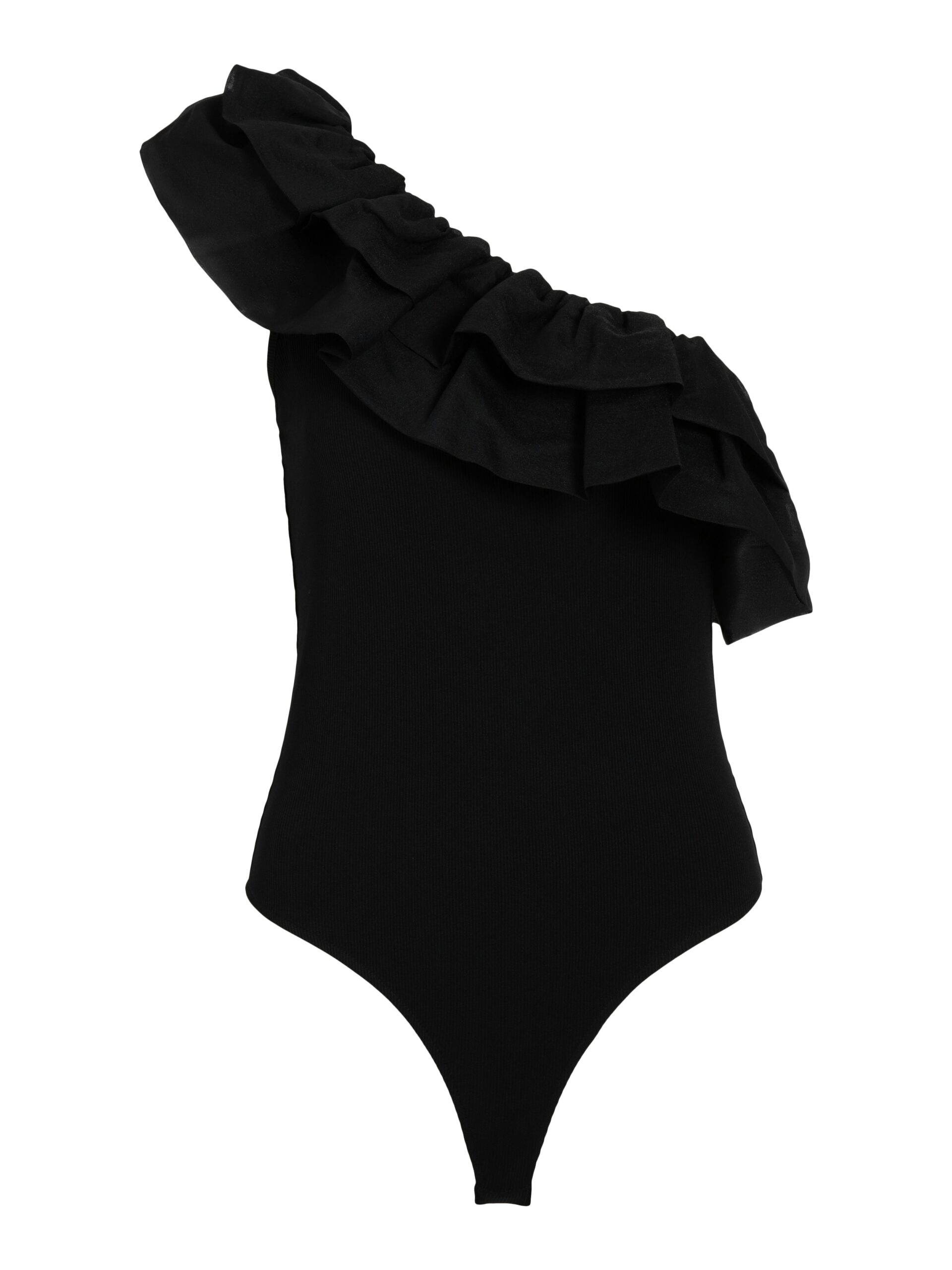 Vila musta yksi olkaiminen body. Joustava rib materiaali. Kapea haarakiila, jossa nepparit. Pääntiessä rypytys.