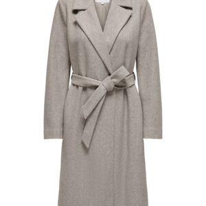 Only beigen värinen takki. Villakangas tyyppinen materiaali, liukaspintainen vuorikangas. Ei kiinnitystä, irrotettava solmittava vyö. Taskut sivuilla.