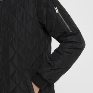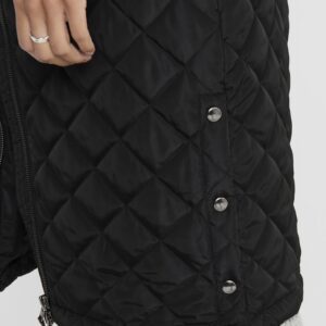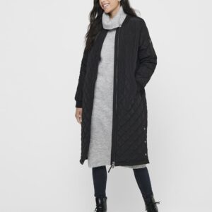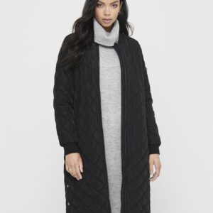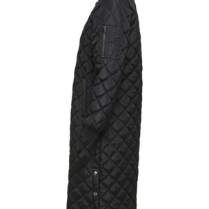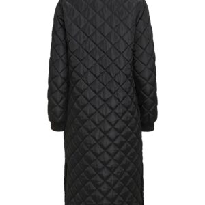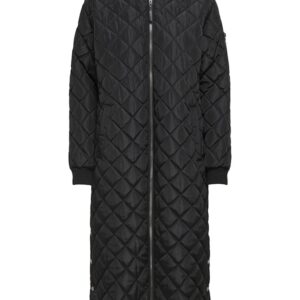 Only musta kevytvanullinen tikkitakki. Pitkä rento malli. Edessä kahteen suuntaan aukeava vetoketju. Sivuilla alhaalla napit. Hihansuissa resorit. Nepparilliset taskut edessä, sekä toisessa hihassa vetoketjullinen tasku.