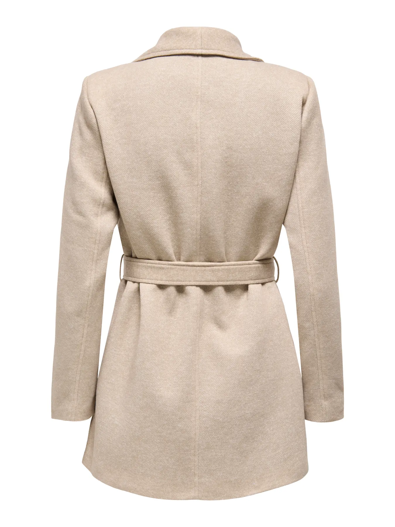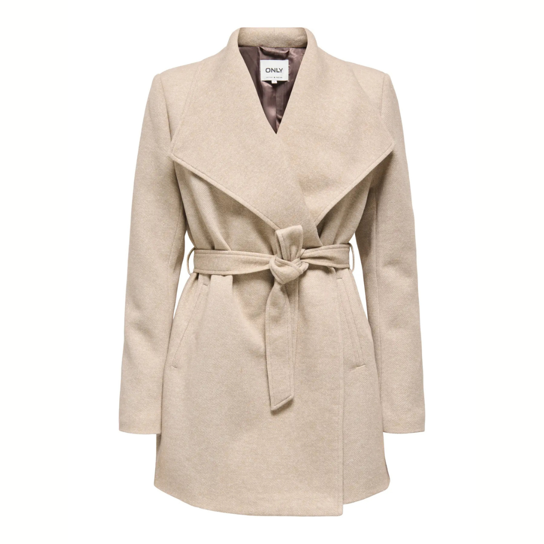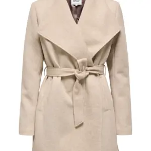 Only beigen värinen kangas takki, jossa ohut satiini vuori. Solmittava irotettava vyö. Avoin malli, ei kiinnitystä. Taskut sivuilla.