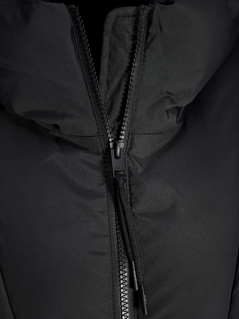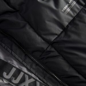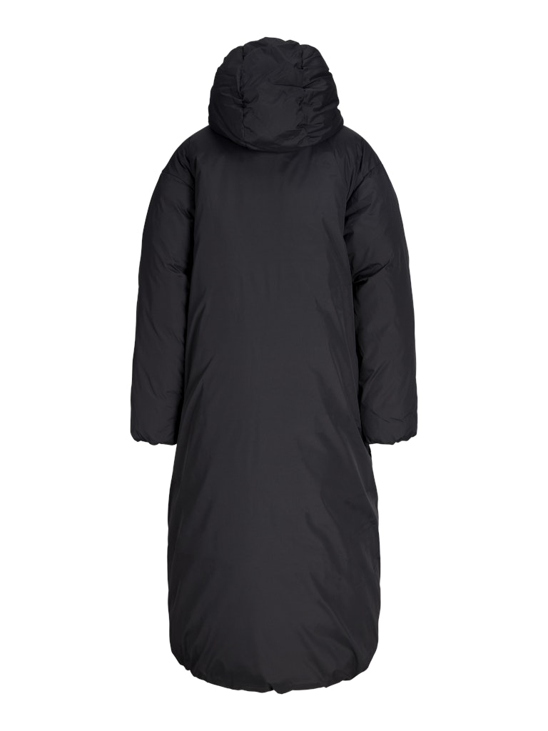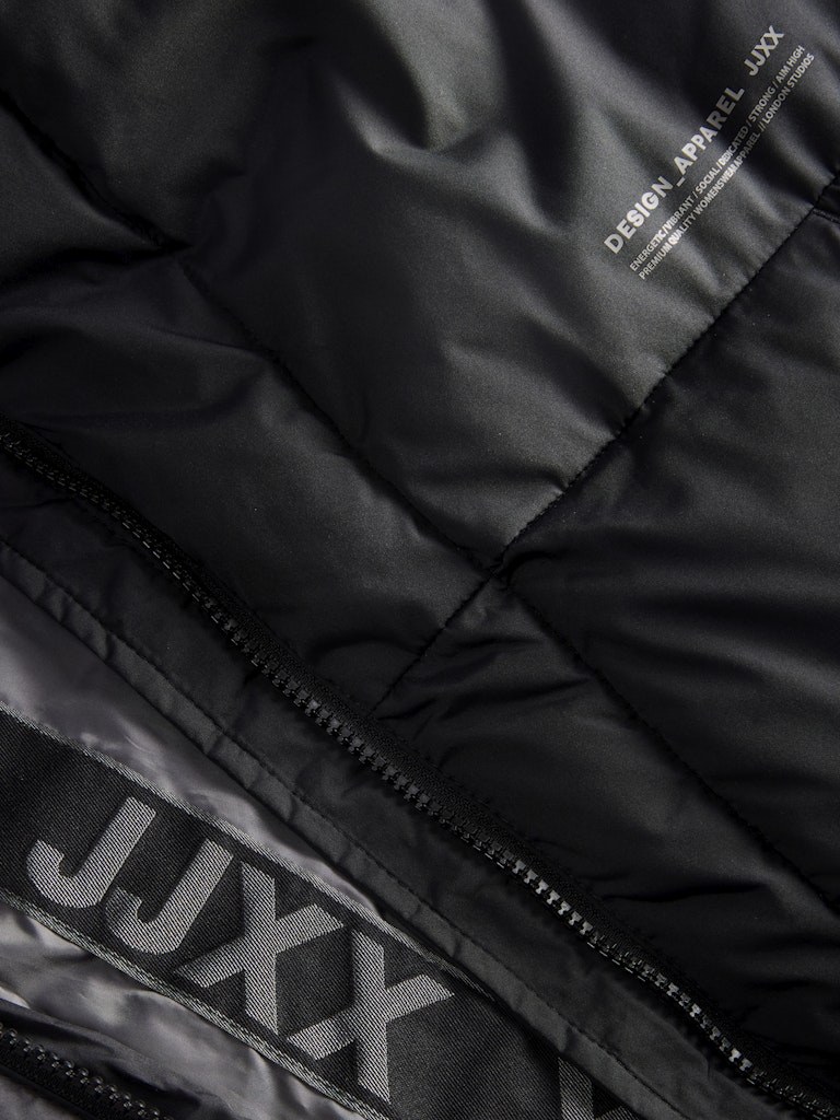 JJXX musta pitkä toppatakki. Rento suora malli. Pehmeä vanuvuori. Nepparilliset taskut sivuilla. Hihansuissa ja helmassa kuminauhat. Huppu, jossa reunassa kuminauha.