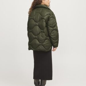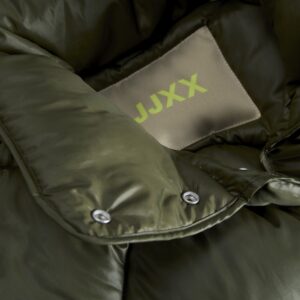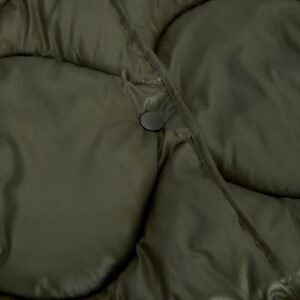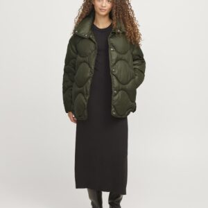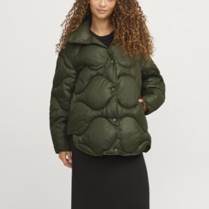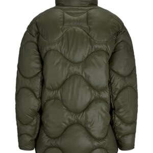 Oliivin vihreä toppatakki. Rento malli. Neppari kiinnitys. Pystykaulus. Viistotaskut sivuilla. Pyöristetty helma. Pehmeä ilmava vanutäyte.