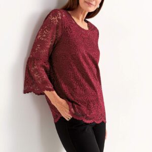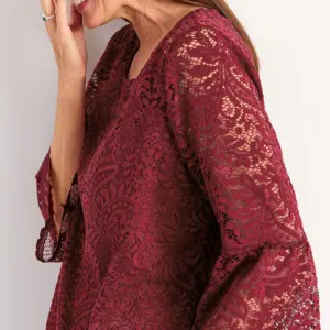 Cellbes viininpunainen pitsipaita. O-pääntie. Läpikuultavat 3/4 mittaiset hihat. Joustava pinta sekä vuorikangas.