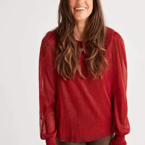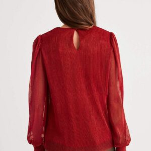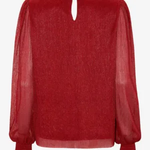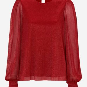 Cellbes punainen kimalteleva pusero. O-pääntie, halkio sekä nappi niskassa. Pliseerattu joustava laskeutuva pintamateriaali. Joustava vuosikangas. Läpikuutavat hihat, joissa hihansuissa joustavat resorit.