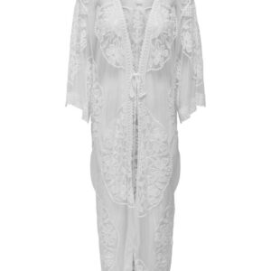 Only luonnonvalkoinen pitkä kimono. Läpikuultava pitsi materiaali. Puolipitkät kimonomalliset hihat. Edessä kiinnitys solmittavilla nauhoilla.