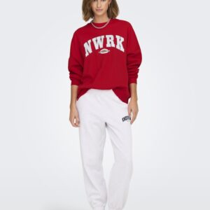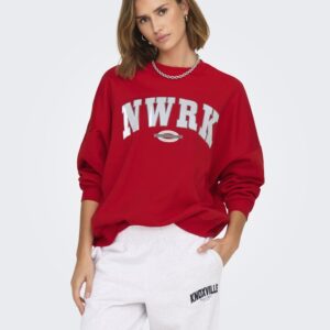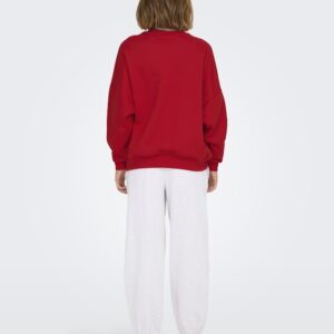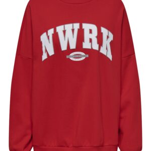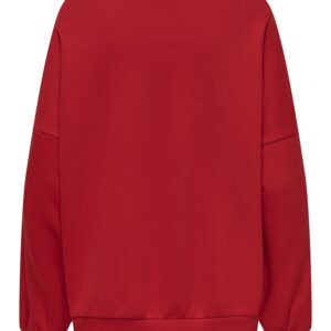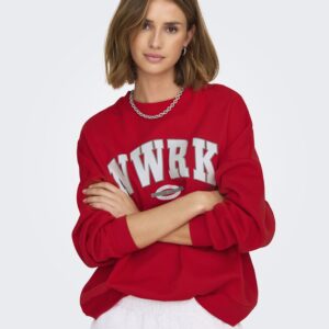 Only punainen sweatari. Edessä painettu teksti. O-pääntie, hihansuissa ja helmassa resorit. Rento malli. Pehmeä harjattu sisäpinta.