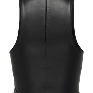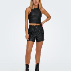 Only musta keinonahkainen toppi. O-pääntie, ohuet olkaimet. Selässä niskassa vetoketju. Joustava keinonahkainen materiaali, joustava vuorikangas. Rinnan kohdalla sivuilla leikkaukset.
