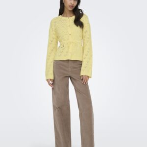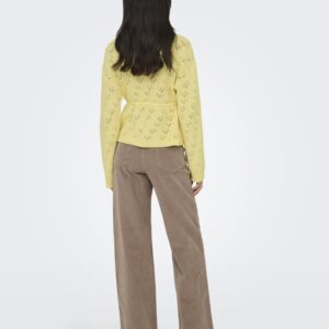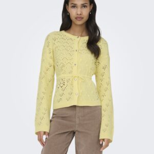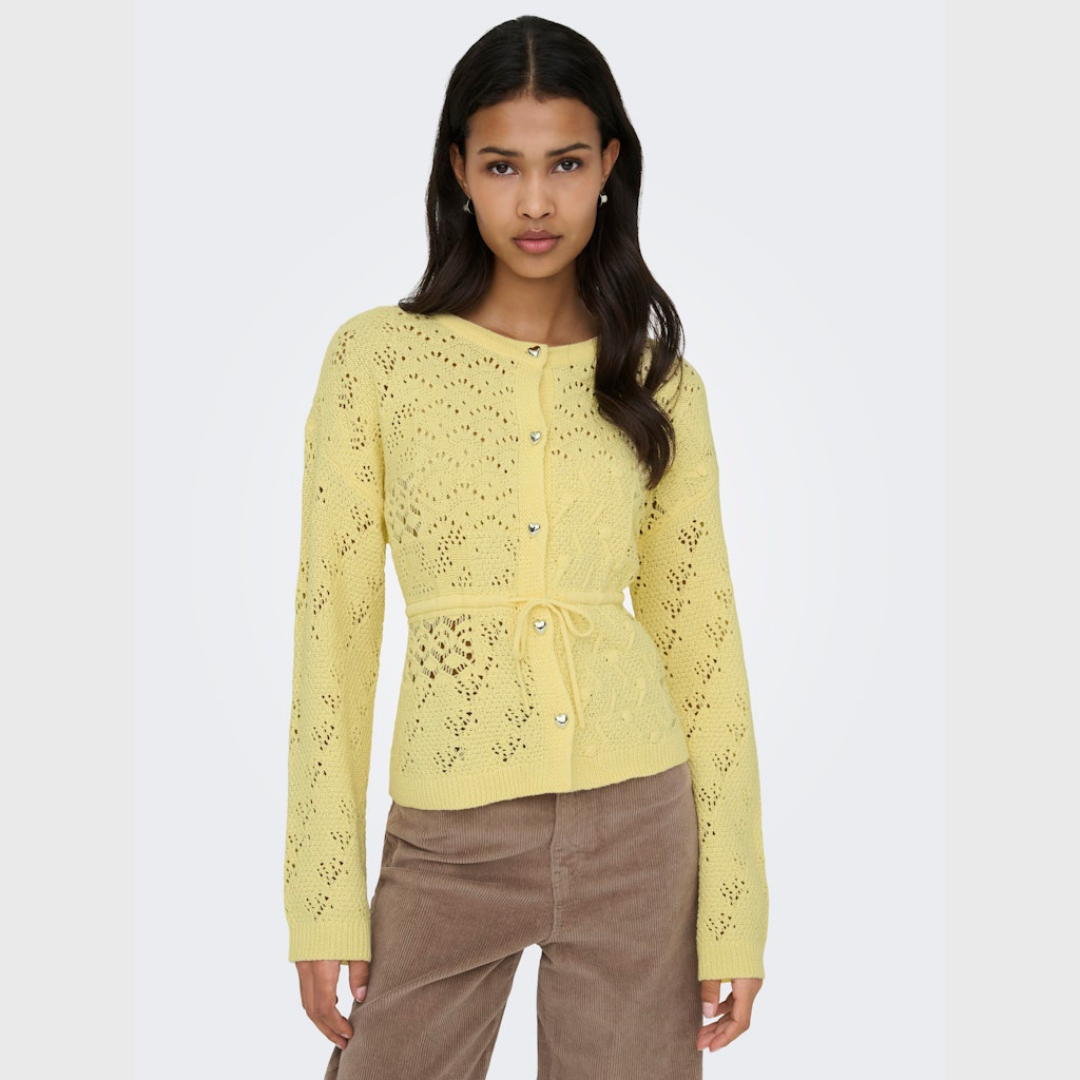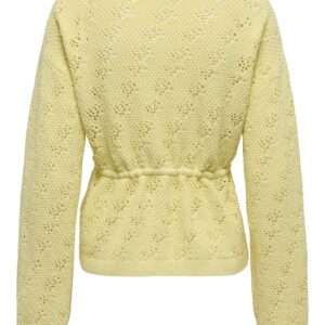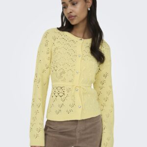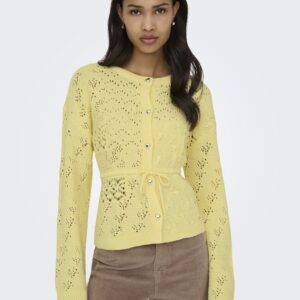 Only vaaleankeltainen neuletakki. Eläväpintainen materiaali. Edessä napitus, jossa sydänmenmalliset hopeanväriset napit. Vyötäröllä kiristysnyöri.