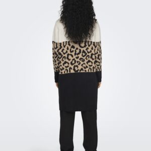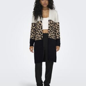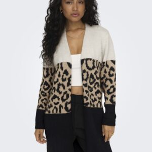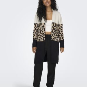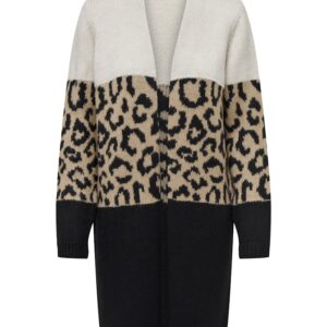 Only eläinkuviollinen/beige/musta neuletakki. Suora avoin malli, ei kiinnitystä. Joustava kudottu materiaali. Hihansuissa ja helmassa resorit.