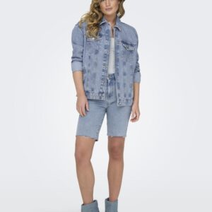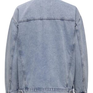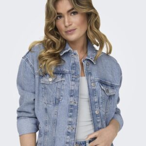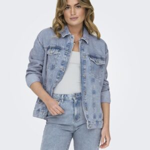 Only vaaleansininen farkkutakki. Rento oversize-malli. Joustamaton materiaali. Napitus edessä sekä hihansuissa. Napilliset taskut edessä, koristetaskut sivuilla.