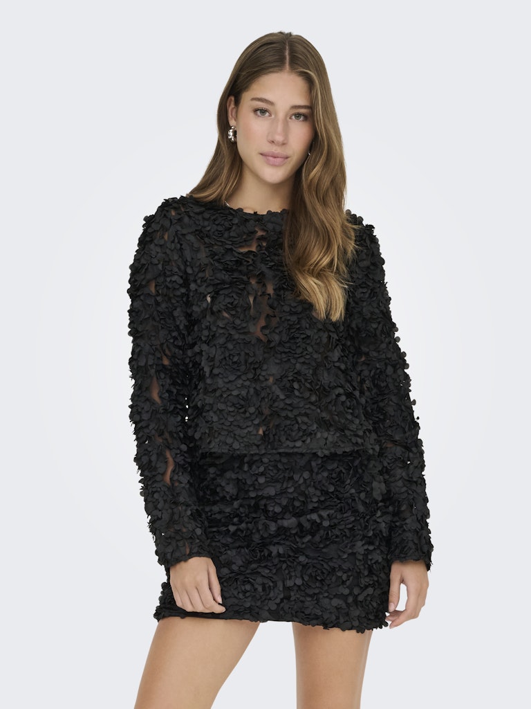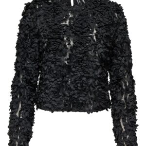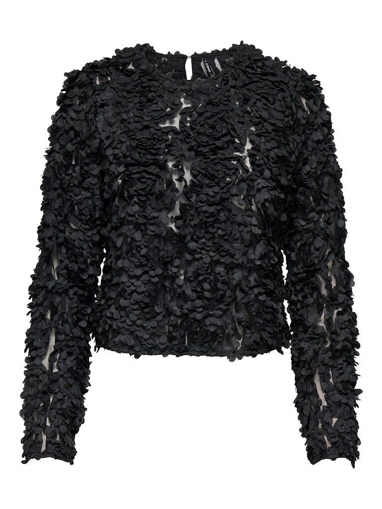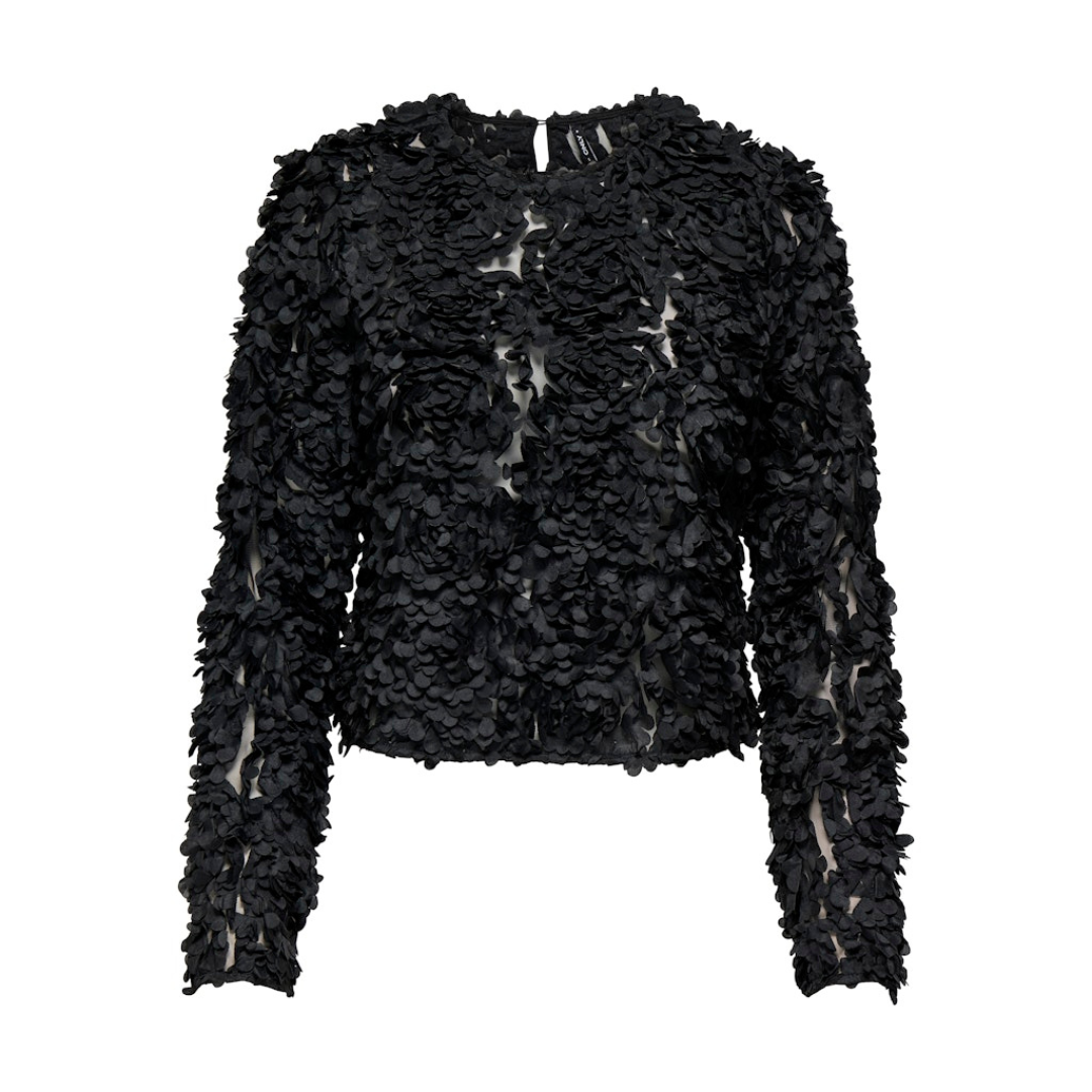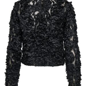 Only musta pitkähihainen eläväpintainen paita. O-pääntie, niskassa nappi sekä halkio. Läpikuultava verkkomateriaali, jossa ommeltuja kohokukkia.