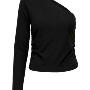 Only musta joustava pusero. Lyhyt tyköistuva malli, jossa molemmissa sivuissa joustavat rypytykset. Viisto pääntie, jossa toisella puolella pitkä hiha.
