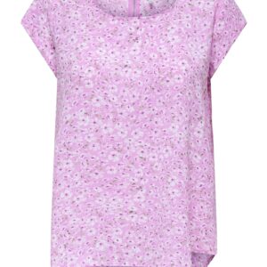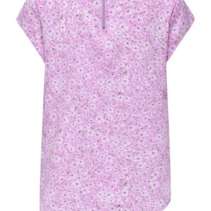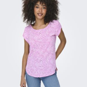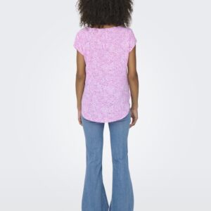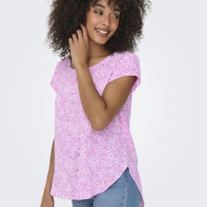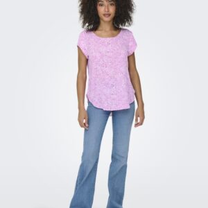 Only vaaleanpunainen kuviollinen toppi. O-pääntie, niskassa vetoketju. Lyhyet holkkimalliset hihat. Pyöristetty helma. Laskeutuva eläväpintainen materiaali.