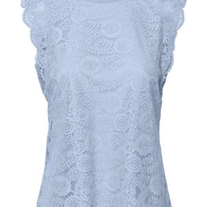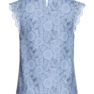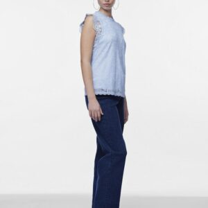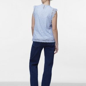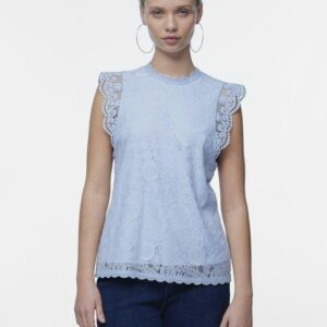 Pieces vaaleansininen pitsitoppi, jossa . O-pääntie, jossa pitsireunus. Niskassa halkio, sekä avattava nappi. Olkapäillä pitsi yksityiskohdat. Joustava vuorikangas.