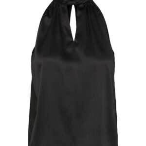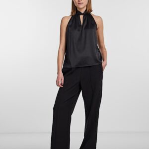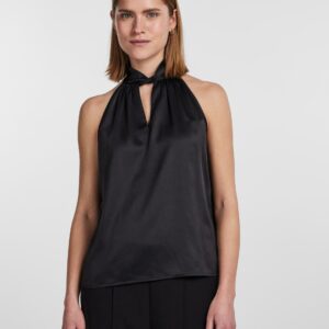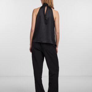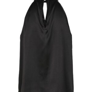 Pieces musta satiini toppi. Korkea kaulus, jossa halkio edessä sekä takana. Niskassa avattavat napit. Suora malli. Laskeutuva liukaspintainen materiaali.