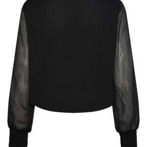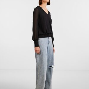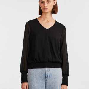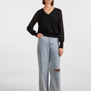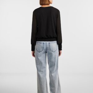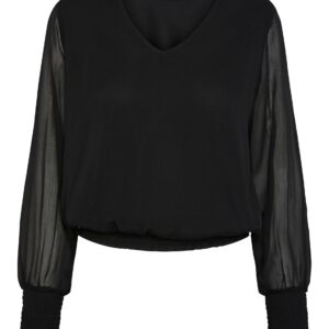 Pieces musta pitkähihainen pusero. Ohuet läpikuultavat hihat, joissa hihansuissa joustavat resorit. Vuorikangas etu sekä takaosassa. Helmassa joustava resori. V-pääntie.