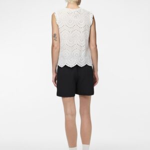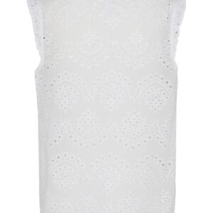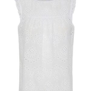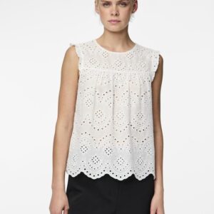 Pieces valkoinen toppi. O-pääntie, niskassa halkio sekä nappi. Reikäkuvioinen materiaali. Poikkileikkaus ja rypytys edessä rinnan yläpuolella. Lyhyet hihat.