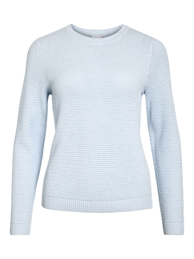 Vila vaaleansininen neulepaita. Eläväpintainen materiaali, O-pääntie. Hihansuissa ja helmassa resorit. Joustava kudottu materiaali.