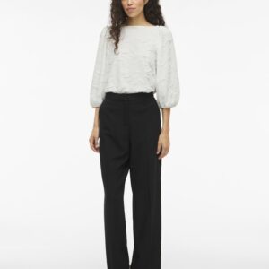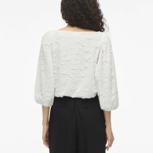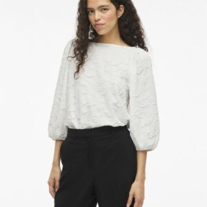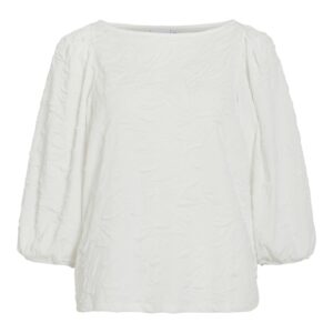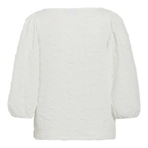 Vila valkoinen 3/4 hihainen pusero. Eläväpintainen joustava materiaali. Venepääntie. Leveät hihat, joissa joustava hihansuu. Olkäpäillä rypytykset.