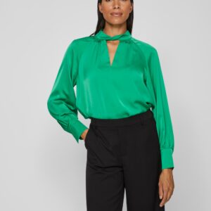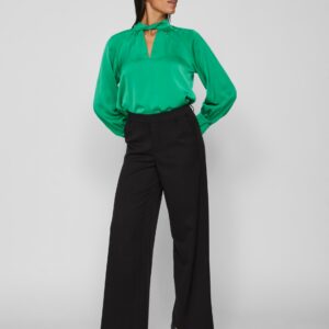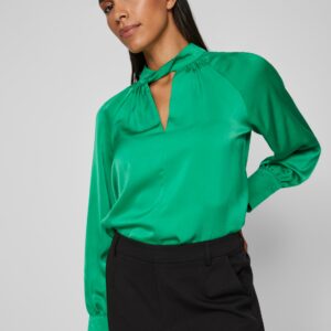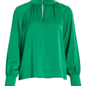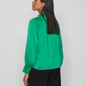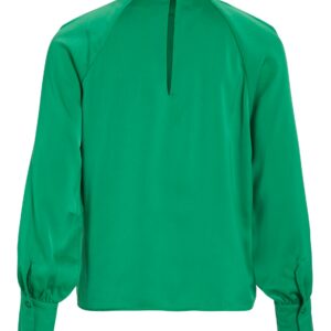 Vila kirkkaan vihreä satiini pusero. Edessä halkio sekä korkea pääntie. Selkäpuolella halkio, sekä avattavat napit. Leveät hihat, joissa hihansuissa napit. Suora helma.