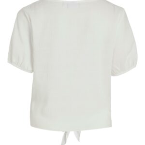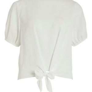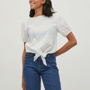 Vila luonnonvalkoinen toppi. Lyhyet puhvimalliset hihat, joissa joustava hihansuu. Venemallinen pääntie. Eläväpintainen materiaali. Helmassa edessä säädettävä solmu.