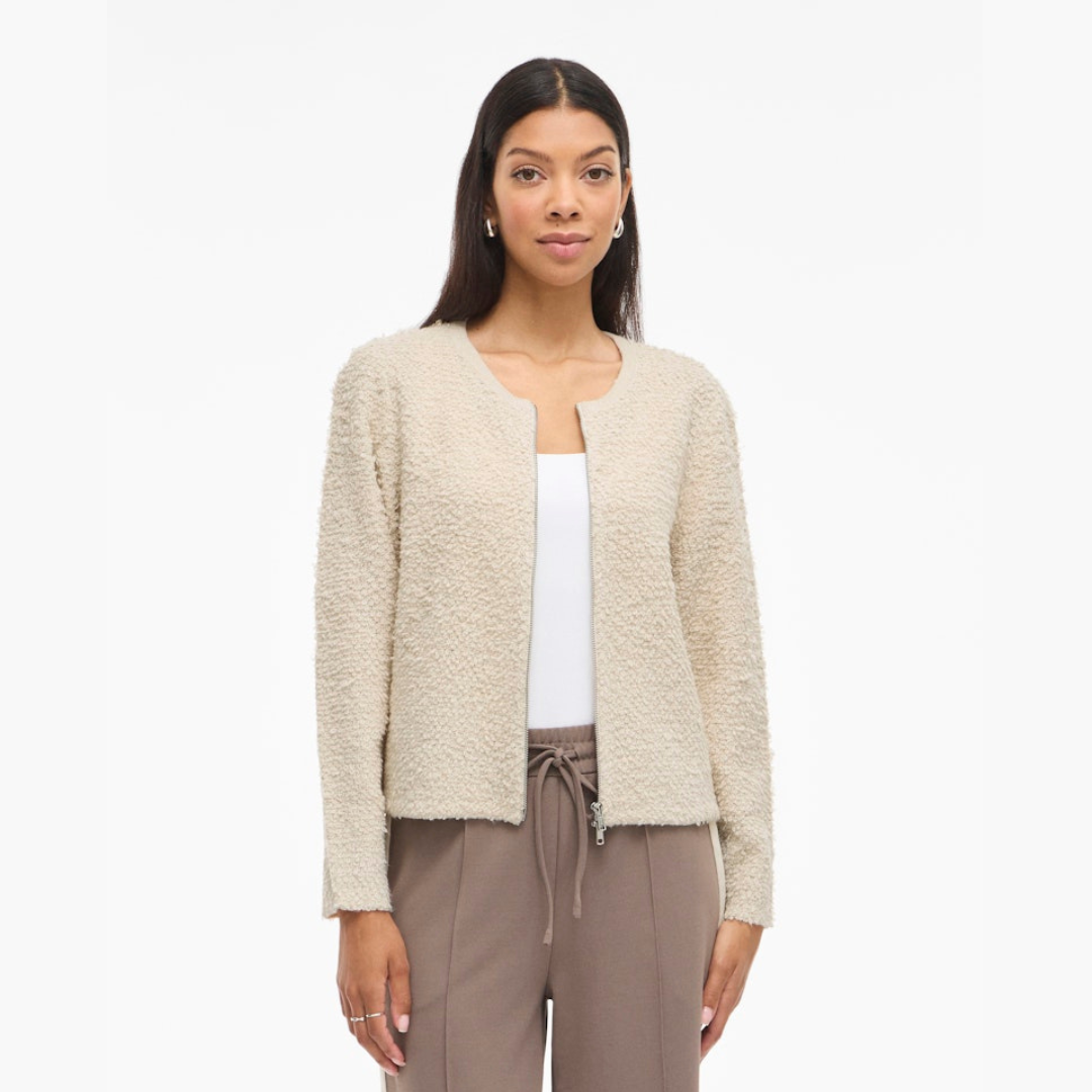Vila luonnonvalkoinen neuletakki. Eläväpintainen joustava materiaali. O-pääntie, suora helma. Edessä kahteen suuntaan aukeva vetoketju.