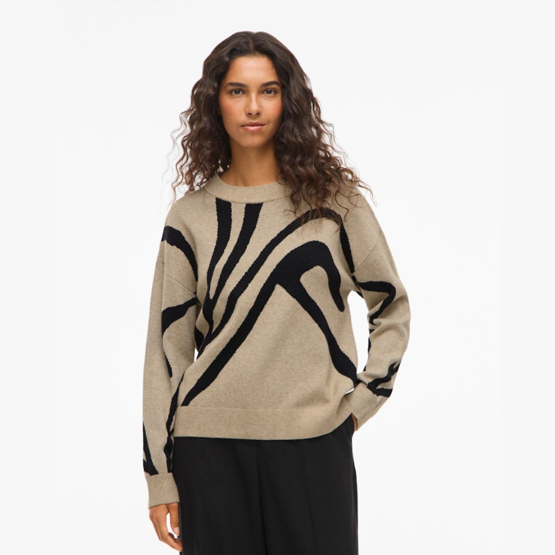 Vila beige / musta kuviollinen neulepaita. Joustava pehmeä materiaali. O-pääntie. Hihansuissa ja helmassa resorit. Rento mitoitus.