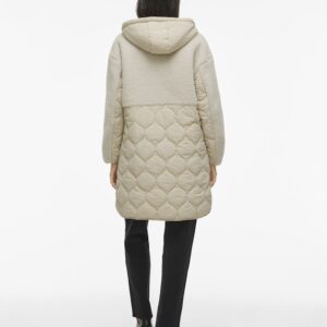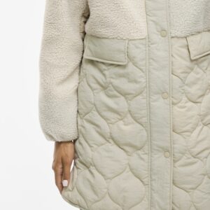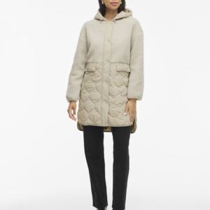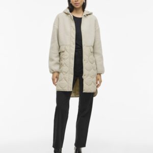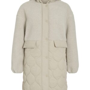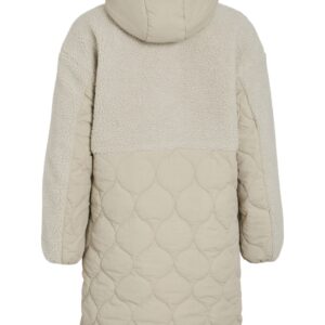 Vila vaalea teddy/tikkitakki. Rento malli. Yläosa teddykangasta, alaosa kevytvanu täytteistä tikkikangasta. Vetoketju + nepparit kiinnitys. Huppu jossa kiristysnyörit. Taskut edessä.