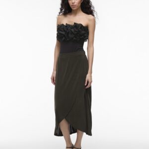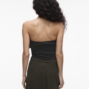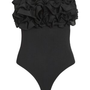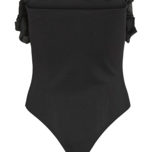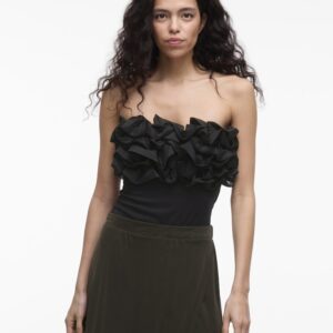 Vila musta body, jossa tuubimallinen yläosa. Yläosassa röyhelö sekä silikooninauha, joka pitää reunan hyvin paikallaan. Kapea haarakaistale jossa avattavat nepparit. Joustava ribattu materiaali.