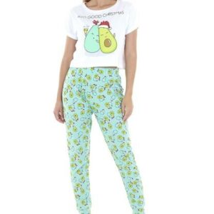 Brave Soul naisten yöasu. Lyhyt valkoinen T-paita, jossa O-pääntie, sekä jouluinen kuva edessä. Pitkät kuviolliset vaaleanvihreät housut, joissa joustovyötärö, sekä lahkeissa resorit. Pehmeät joustavat materiaalit.