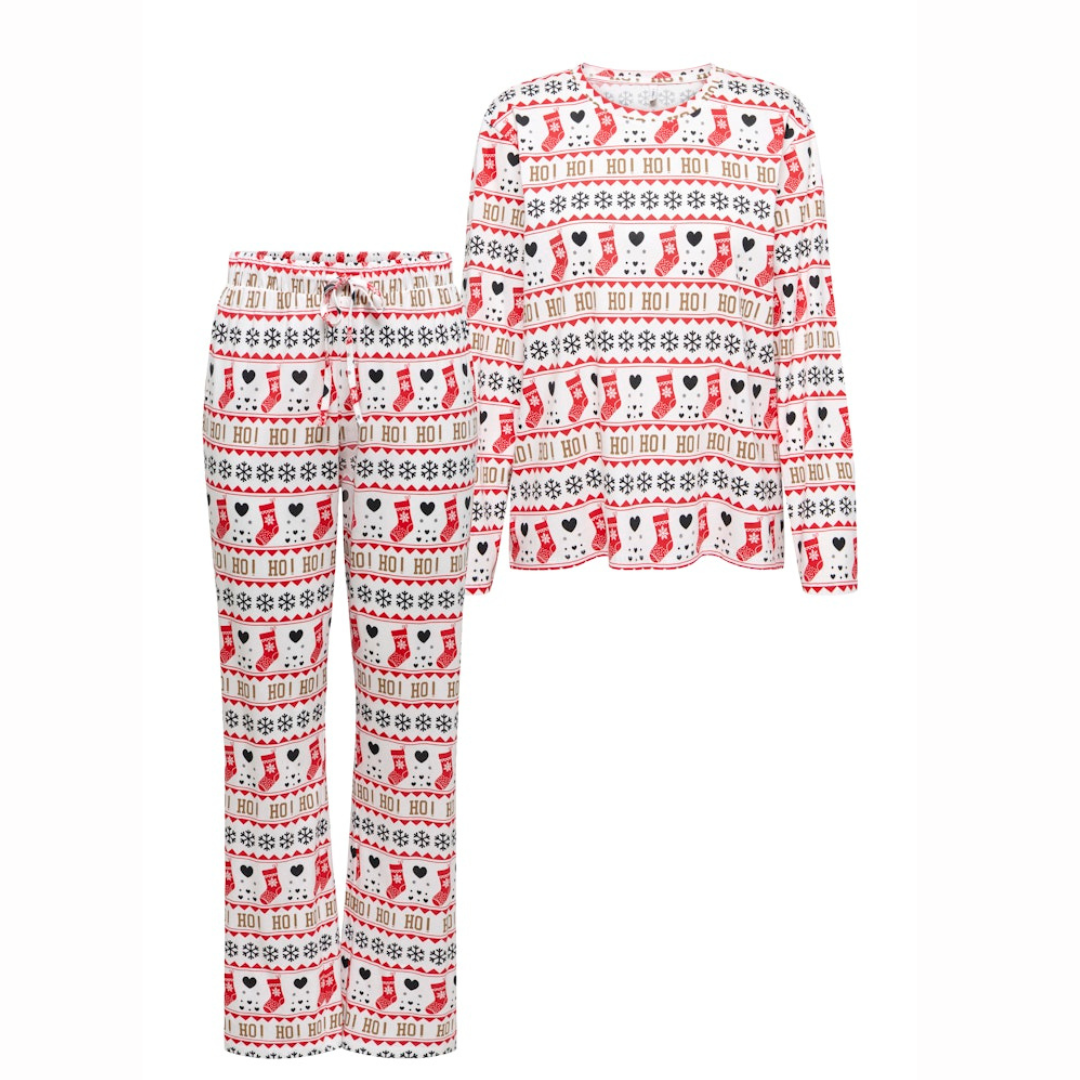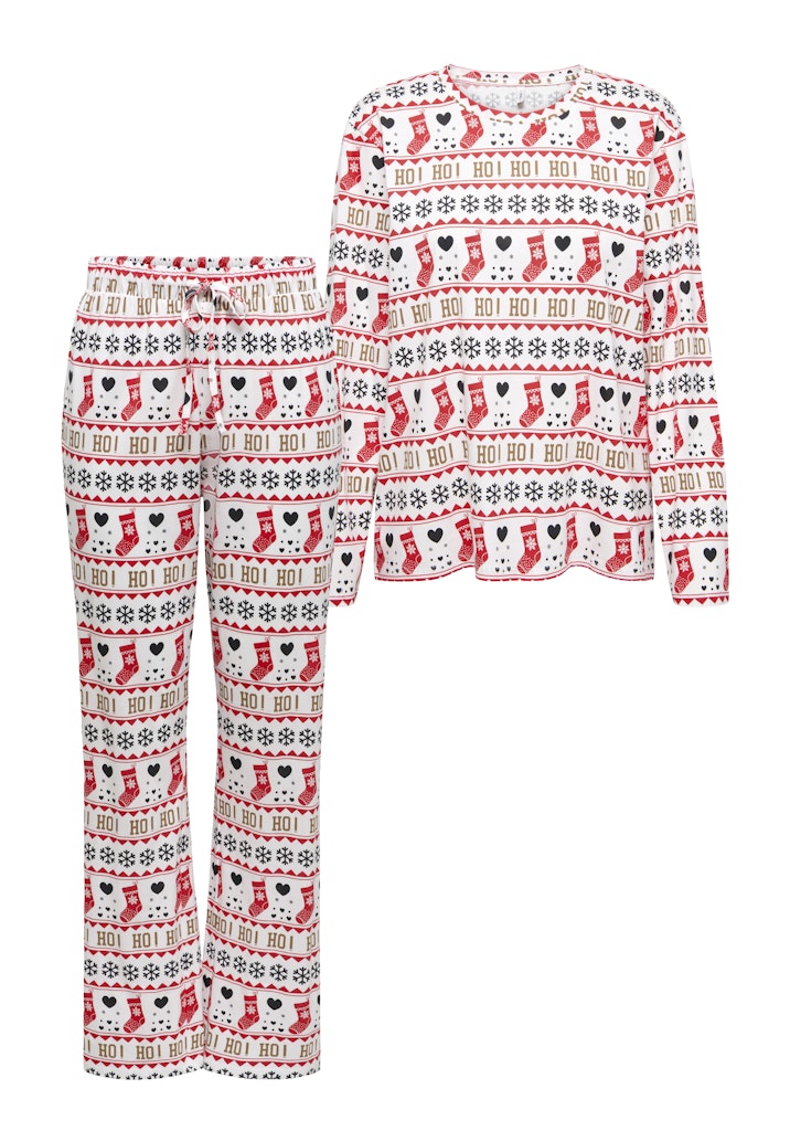 Only valkoinen/ kuviollinen jouluinen yöasu setti. Pitkähihainen paita, jossa suora helma ja O-pääntie. Suorat leveät housut, joissa kuminauha vyötärö sekä solmittava nauha vyötäröllä.